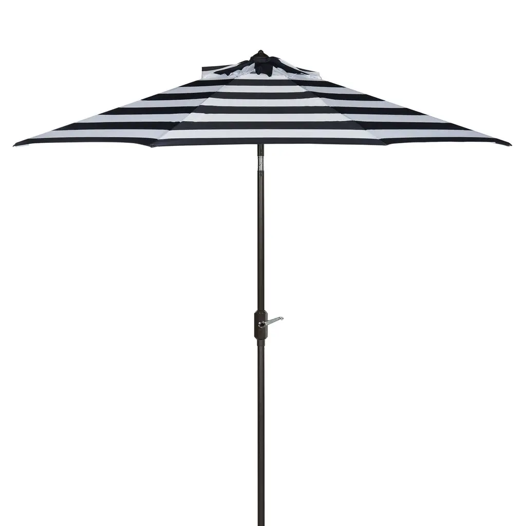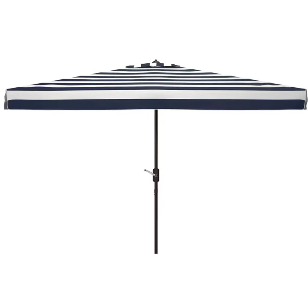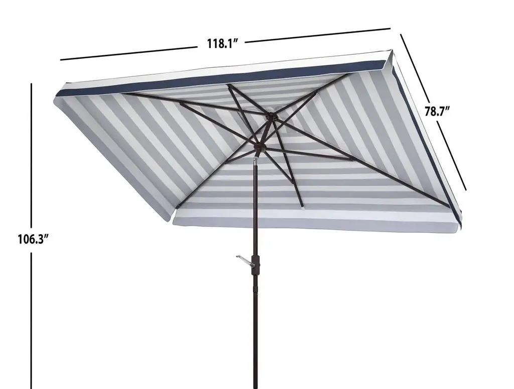 Inspired by the healing waters in a luxurious health spa in Germany’s village of Baden Baden, this stylish rectangleangular market umbrella is a favorite for those who love a touch of Euro flair. The always in fashion black and white stripes keep it classic, while its elegant trim gives it a subtle modern update. Open Dimensions: 118.11" x 78.74" x 106.3" Closed Dimensions: 6.1" x 106.3" Care Instructions: Store outdoor furniture indoors or cover well when not in use. Remove wooden furniture from standing water. Dust regularly with small brush or vacuum. Spills should be taken care of immediately before they harden or stain with a slightly dampened sponge. Do not use bleach solutions.