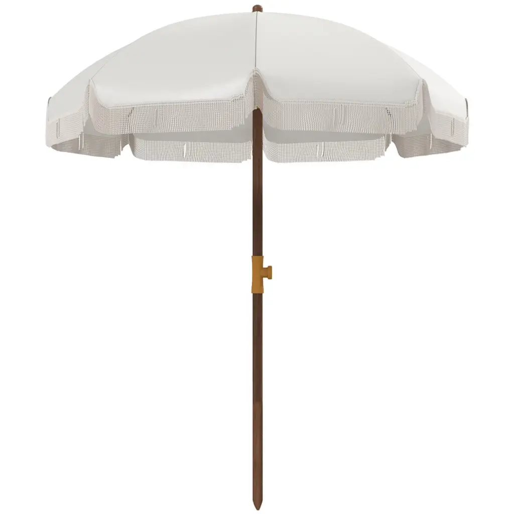 Discover the elegance of relaxation with the Estonia 6.5 ft Fringe Beach Umbrella. This umbrella, dressed in classic White, offers a stylish retreat from the sun. The intricate fringe detailing adds a touch of charm to your beach setup, making every outing feel like a special occasion. Designed for effortless assembly and transport, this umbrella brings convenience alongside its appealing aesthetics. Whether you are sunbathing by the shore or enjoying a sunny afternoon picnic, this umbrella ensures you are comfortably shaded. Embrace the tranquility and style of the Estonia Fringe Beach Umbrella on your next outdoor adventure.