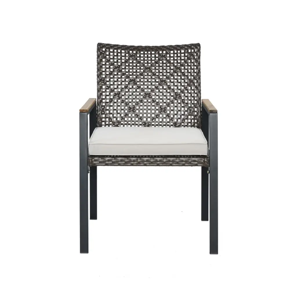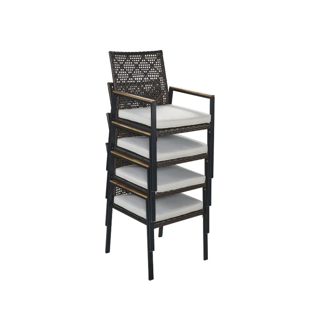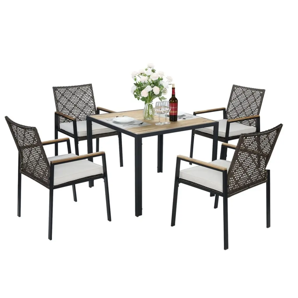 Enjoy outdoor dining in style with this all-weather 5-piece patio dining set featuring a rich coffee brown rattan frame and a durable acacia wood tabletop with a built-in umbrella hole. Perfect for patios, backyards, or gardens, this set includes four comfortable cushioned chairs designed for lasting durability and weather resistance. Ideal for gatherings and relaxing meals in any season.