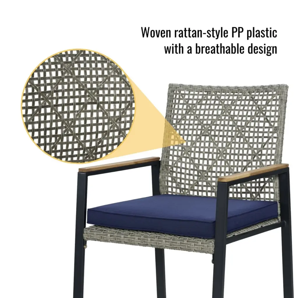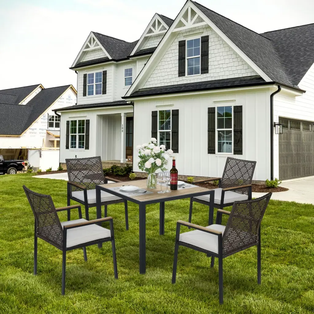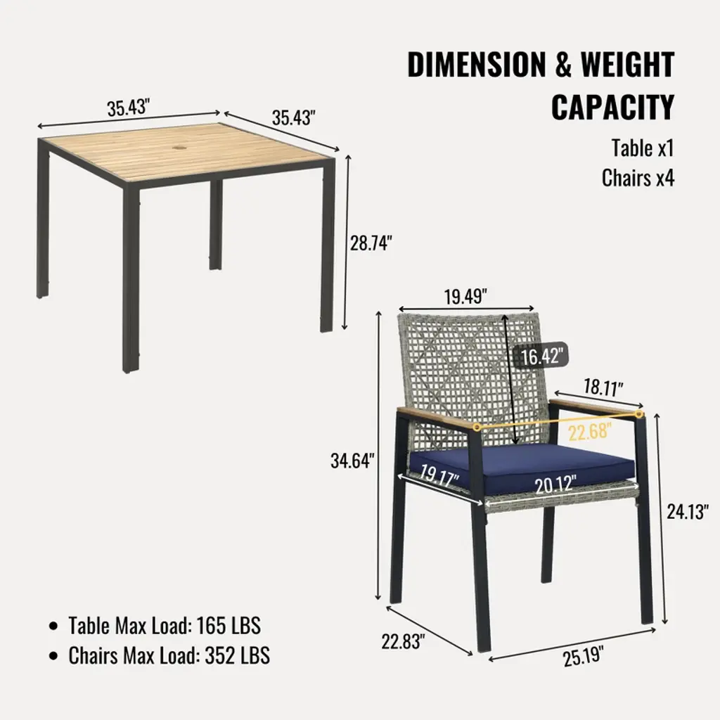 Elevate your outdoor dining experience with this all-weather 5-piece patio dining set. Featuring a durable acacia wood tabletop with a convenient umbrella hole, this light gray rattan conversation set is perfect for backyard, patio, or garden gatherings. Designed for lasting comfort and style, it includes four matching chairs with weather-resistant cushions to keep you comfortable during every meal or social event.