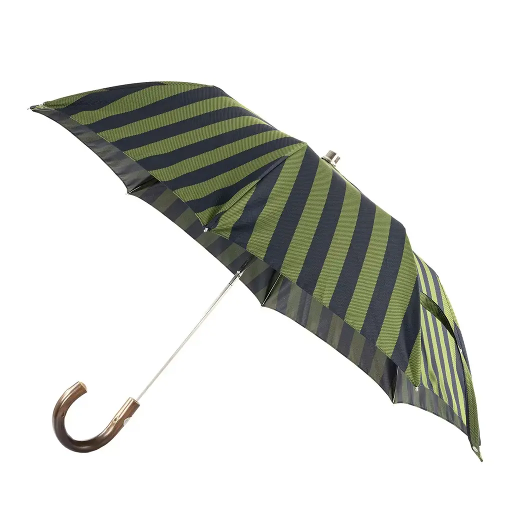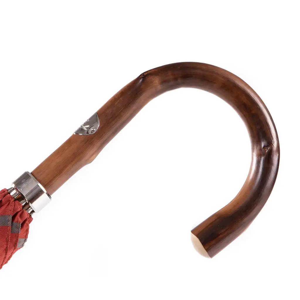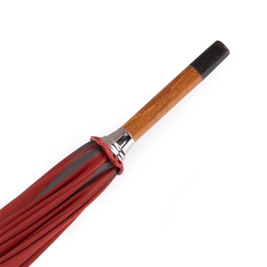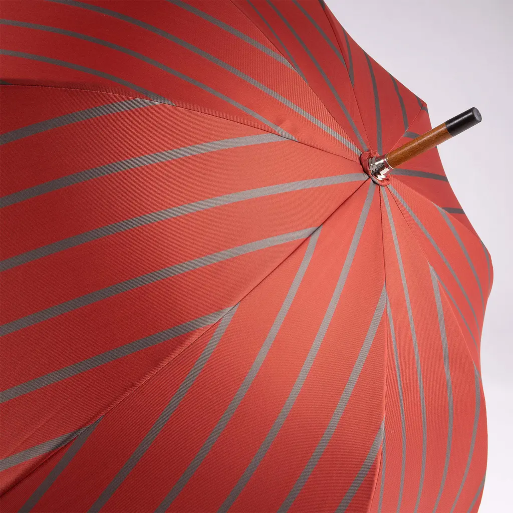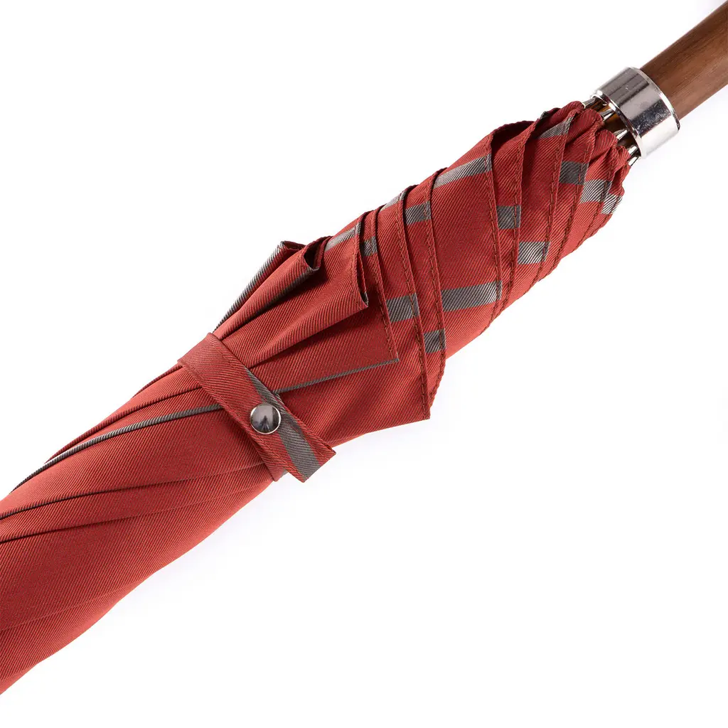Bringing a vibrant chic accent to a gloomy day, this masterfully handcrafted umbrella will highlight an elegant or more casual outfit with style. Showcasing a classic regimental red stripe canopy with a polished chestnut wood shaft and handle, along with solid brass metal details, this outstanding accessory will weather any storm.