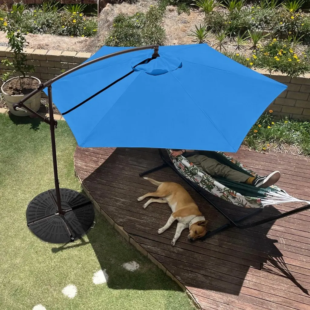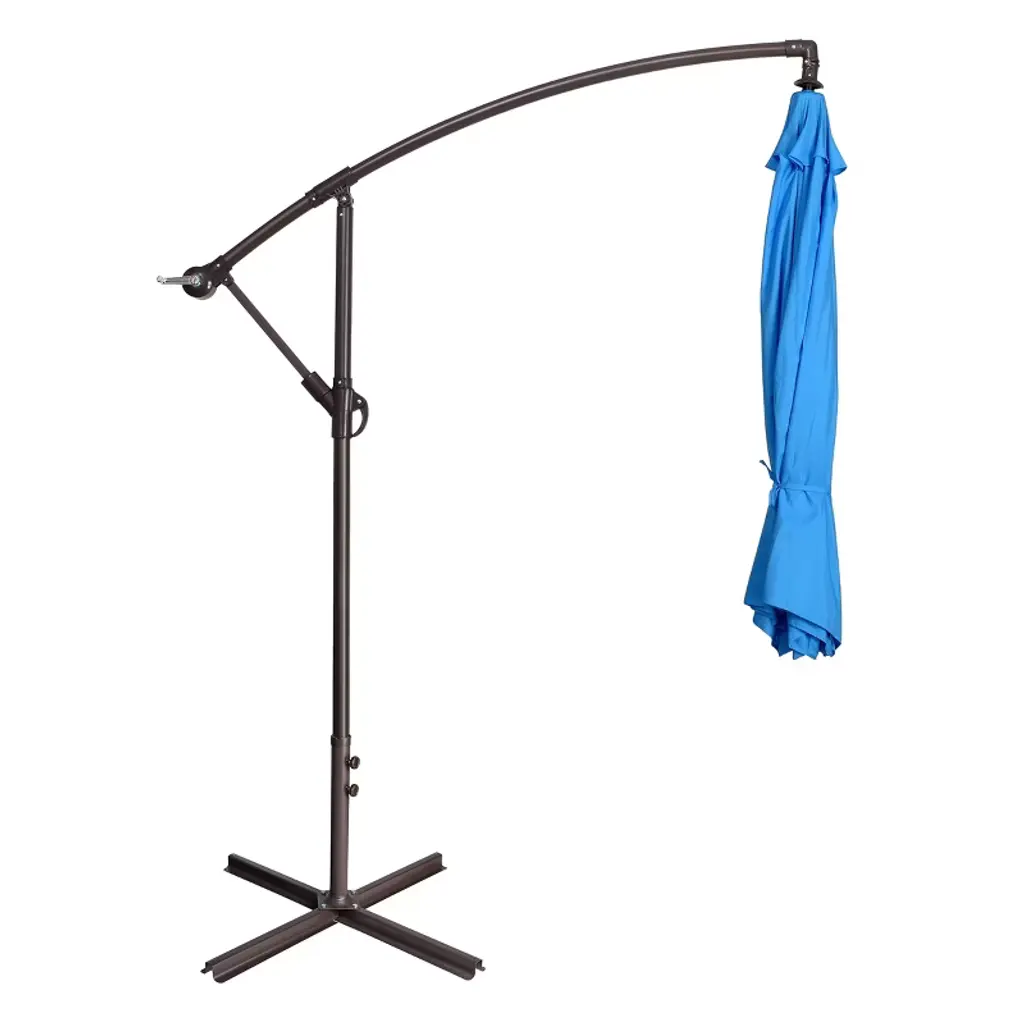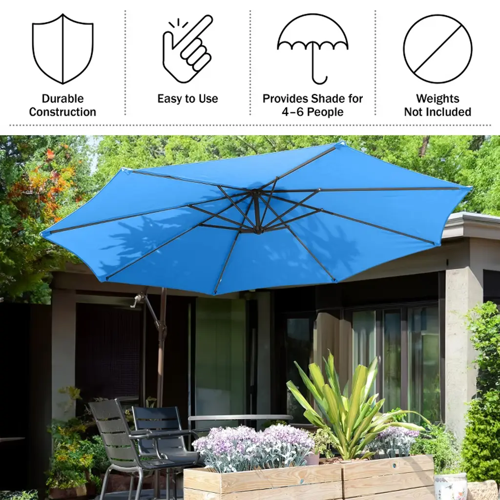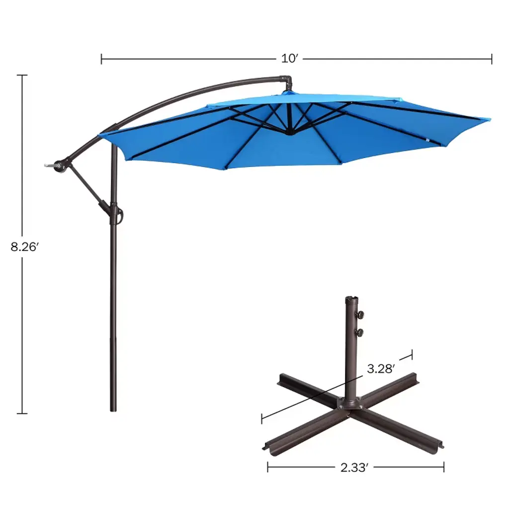 Create a cool and comfortable spot to entertain guests under an attractive piece of outdoor decor with the 10’ Hanging Umbrella Patio Shade by Nature Spring. The easy-to-use hand-crank opens and closes the large patio umbrella in seconds, and the convenient handle allows you to adjust the vertical tilt of the pool umbrella in 5 positions, providing protection from angled sunlight. Simply crank the deck umbrella closed when not in use and use the built-in strap to secure it to the pole. This large outdoor umbrella includes a stable cross base that is made with durable steel for superior value