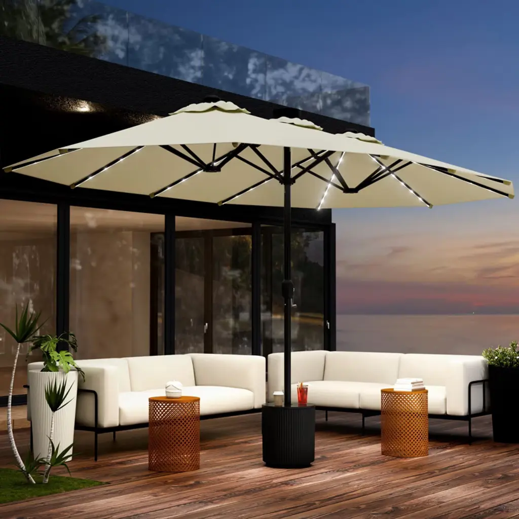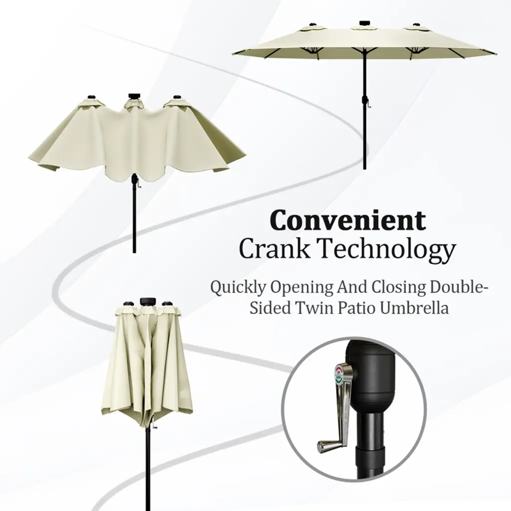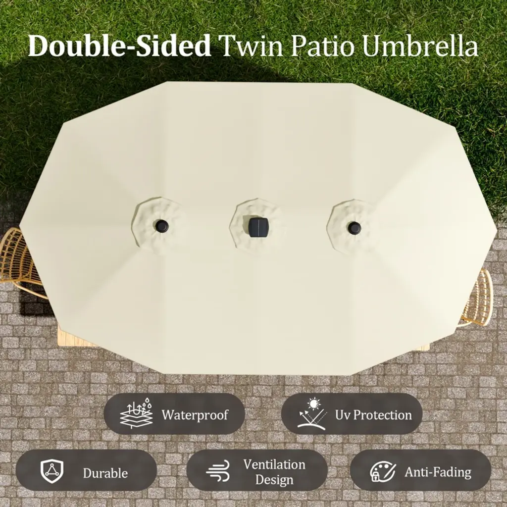 This double - sided patio umbrella features a wide - covering twin design, weather - resistant fabric, and easy crank operation. With spacious shade and versatile use, it brings convenience and cool comfort to various outdoor settings.