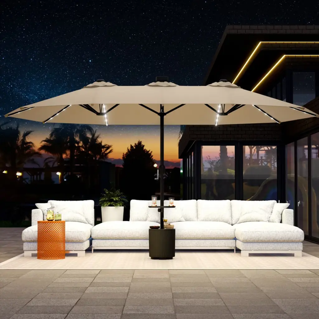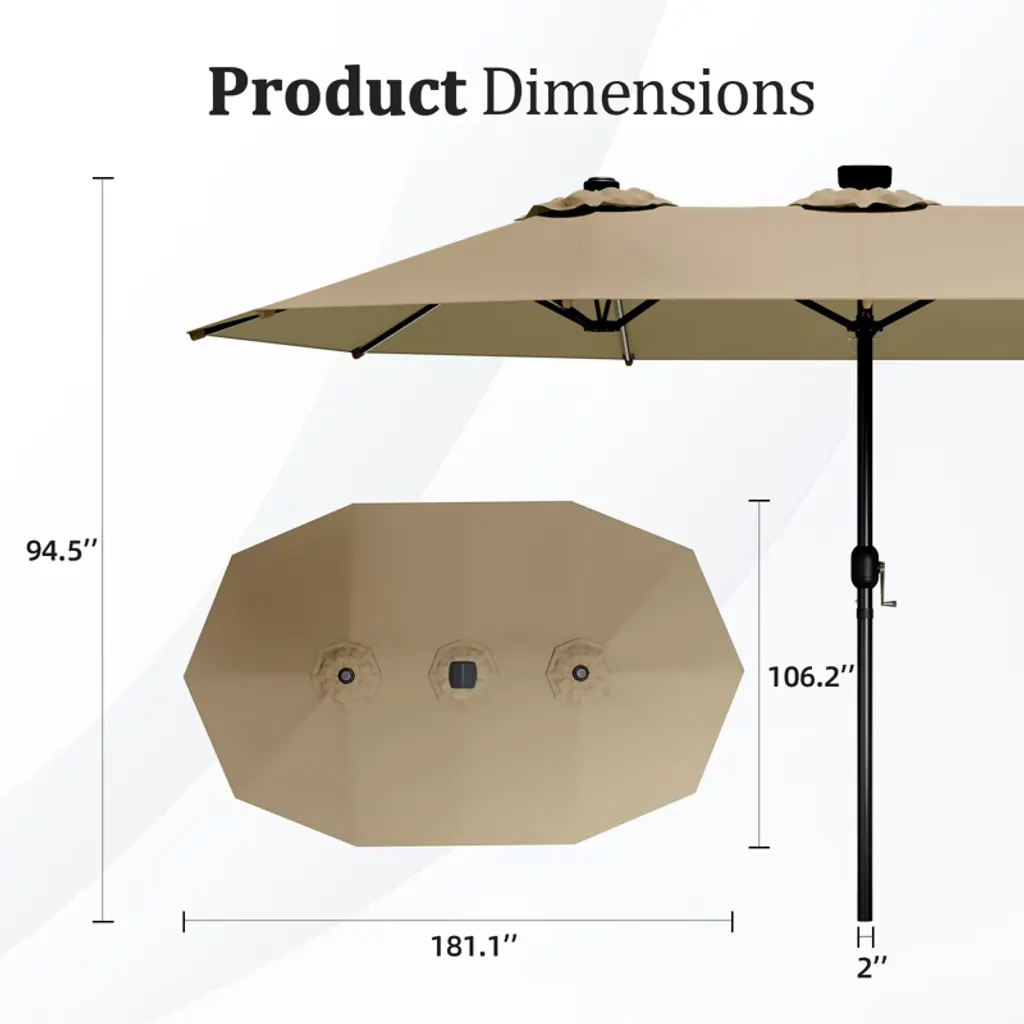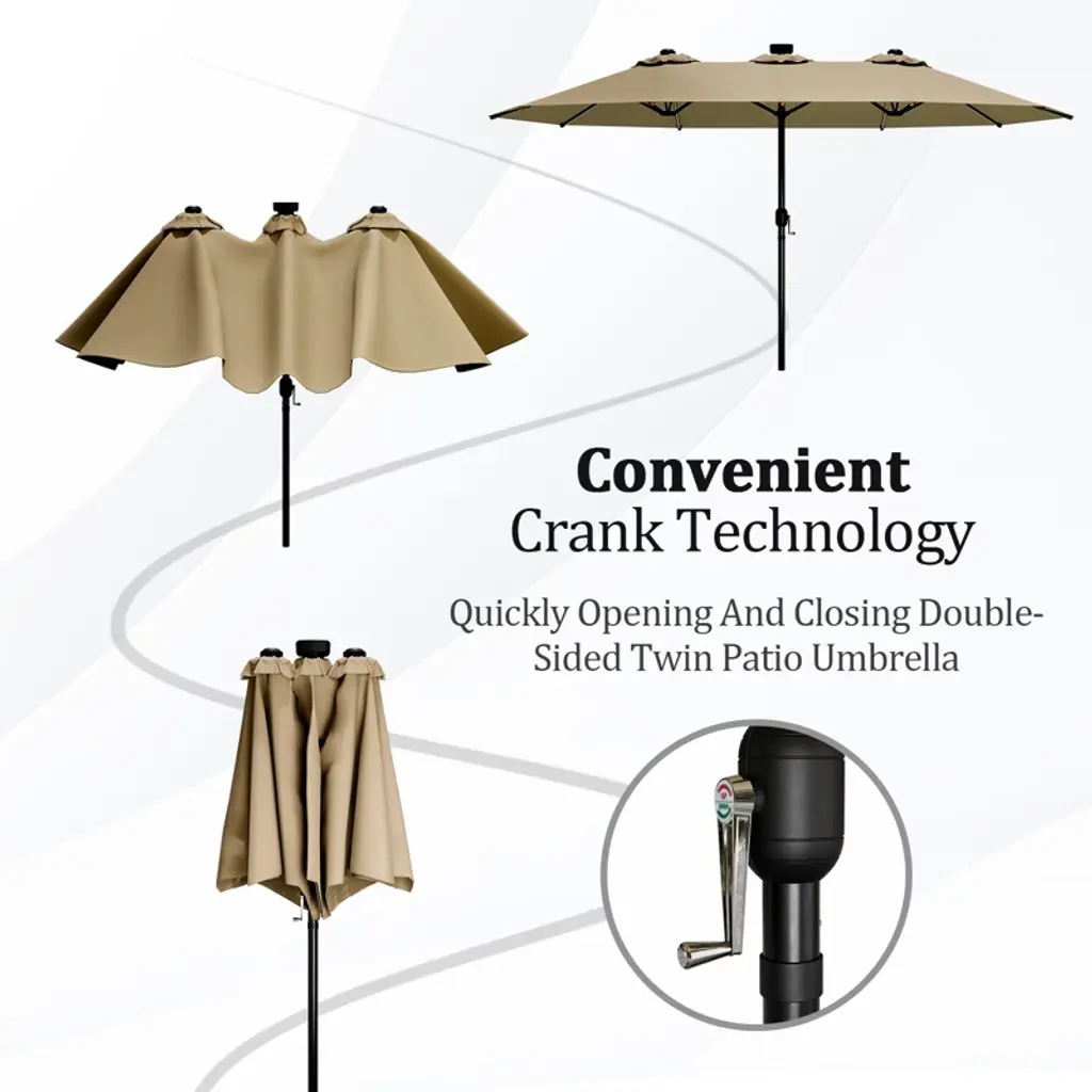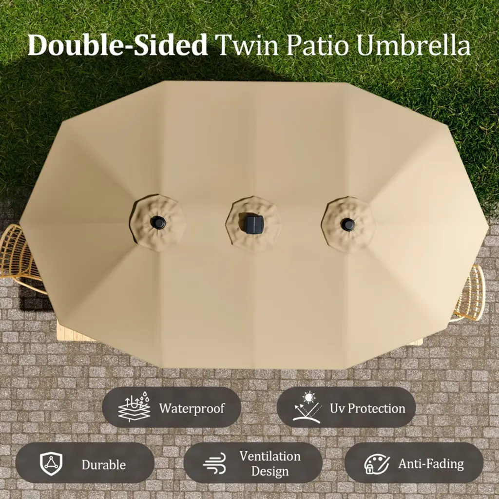 This double - sided patio umbrella features a wide - covering twin design, weather - resistant fabric, and easy crank operation. With spacious shade and versatile use, it brings convenience and cool comfort to various outdoor settings.