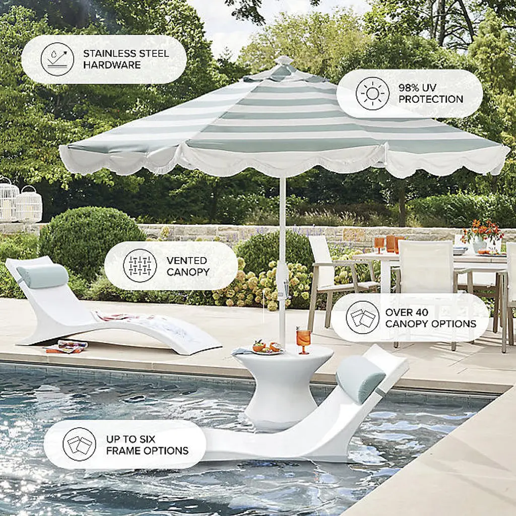 Our Resort Umbrella provides the finest protection under the sun, allowing you to personalize your outdoor space with more than 40 canopy options, two frame materials (aluminum or teak) and multiple aluminum frame finishes. Each canopy blocks skin-damaging UV rays, while resisting dirt and mildew. All frames are outfitted with stainless steel hardware. Canopy: Sunbrella® acrylic fabric All fabrics are 100% Sunbrella® except for Amber Sunbrella® fabrics awarded the Seal of Recommendation by the Skin Cancer Foundation for providing up to 98% UV protection Resists fading, stains, mold, dirt and mildew Vented canopy allows hot air to circulate Spot clean with mild soap and water Allow wet canopy to dry in an open position before closing Frame and Pole: Frame available in Aluminum or Natural Teak Aluminum frame available in various finish options Endura-Teak frame is aluminum with a faux-wood finish, for a teak look that won't patina over time Teak frame features an easy-to-use, double-pulley opening system; teak frame does not tilt Teak frame will develop a lovely silver patina with age if left untreated Aluminum frame is scratch- and rust-resistant Aluminum frame is fitted with a classic crank operation and an auto-tilt function Stainless steel hardware 1-1/2-inch-diameter pole Treat areas subject to turning and sliding with a non-staining, silicone-based lubricant spray Can be used freestanding in a 50 lb. base or placed in a table Assembly instructions Additional Information: Canopy and frame ship separately Base sold separately Minor assembly required When not in use, close and cover umbrella with a protective cover (not included) Imported A Frontgate exclusive. At Frontgate, our primary focus is quality. We guarantee that every product we sell will stand up to the supreme test – our customers' satisfaction. To learn more about our policies, visit our Shipping & Processing, Returns & Exchanges and Warranty & Price Guarantee pages.