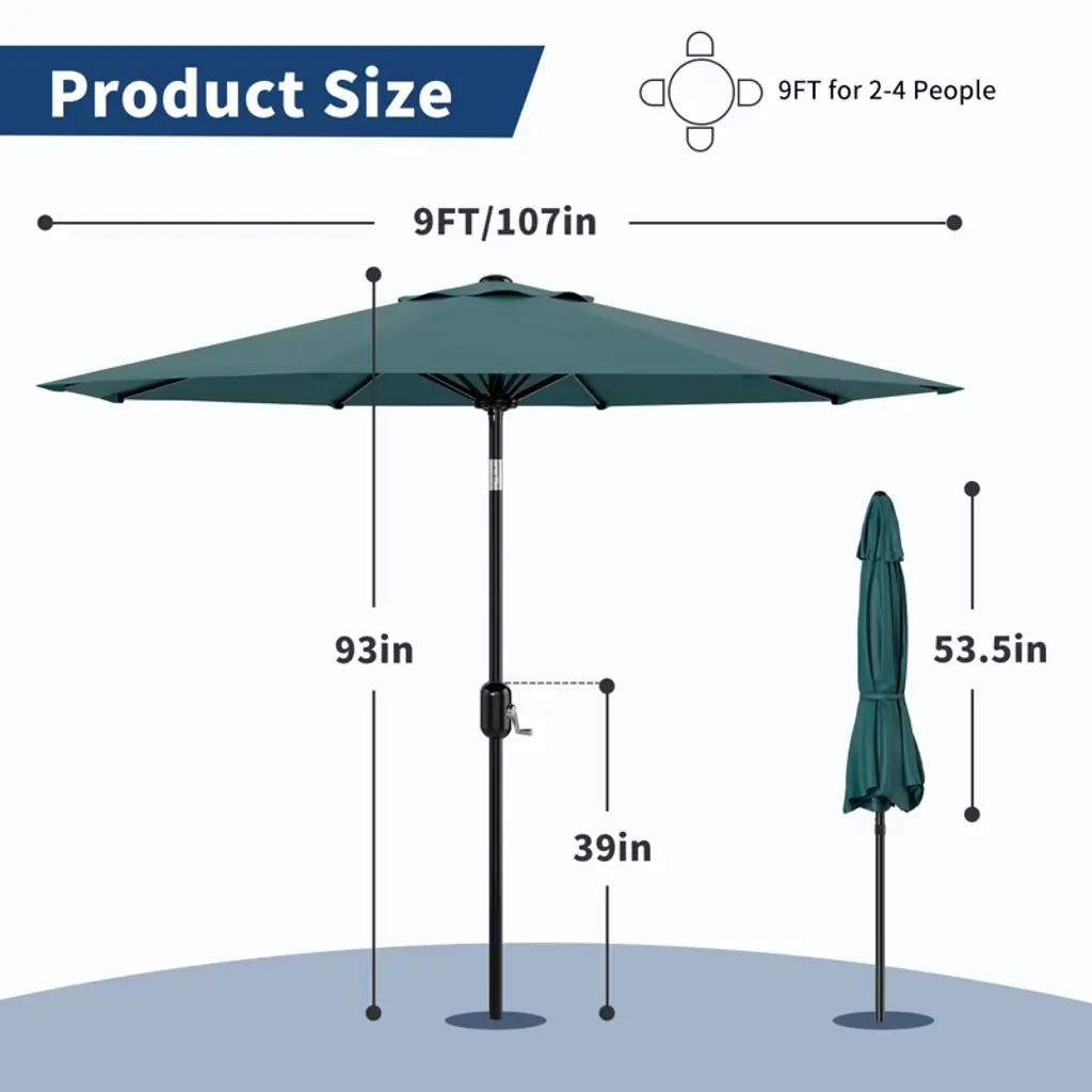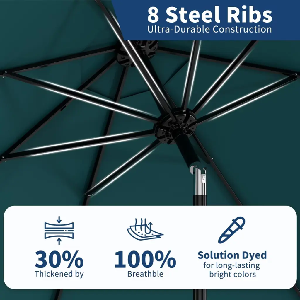 9Ft Patio Umbrella - 8 Sturdy Ribs Outdoor Table Umbrella with Crank Lift & Push Button Tilt - Market Umbrella for Pool, Deck, Garden - Blue