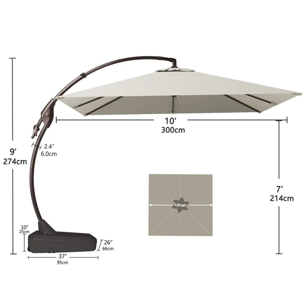 This 10 X 10Ft outdoor offset umbrella is made for home outdoor leisure on the lawn, in the backyard, poolside, deck or dockside, garden, and any other outdoor areas. It's quick and easy to open and close the outdoor patio umbrella with the hand-crank. This cantilever umbrella includes a base -- to fill for weighted stability-- with integrated wheels for easy moving. The square canopy allows multiple umbrellas to be used side-by-side for continuous shade without gaps.