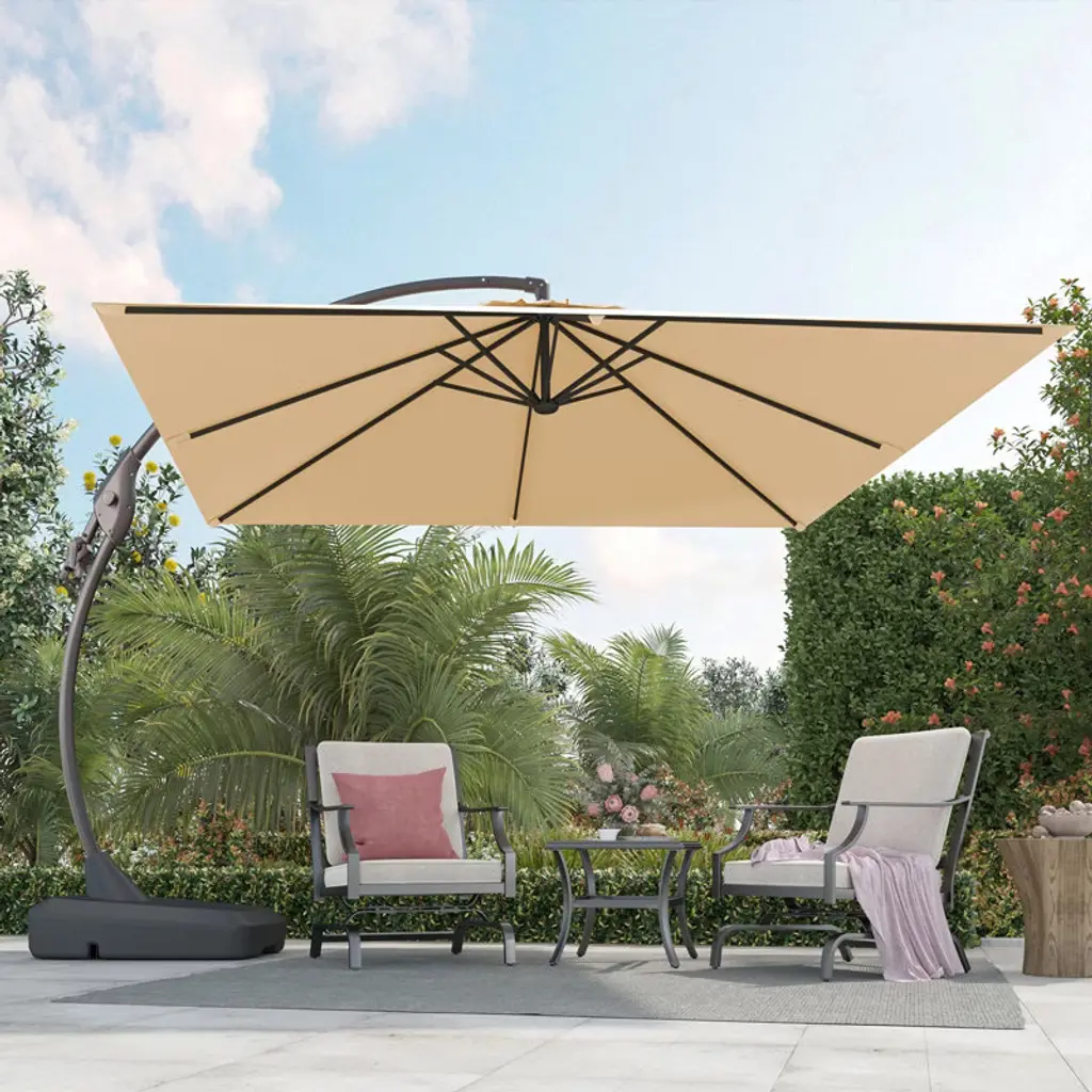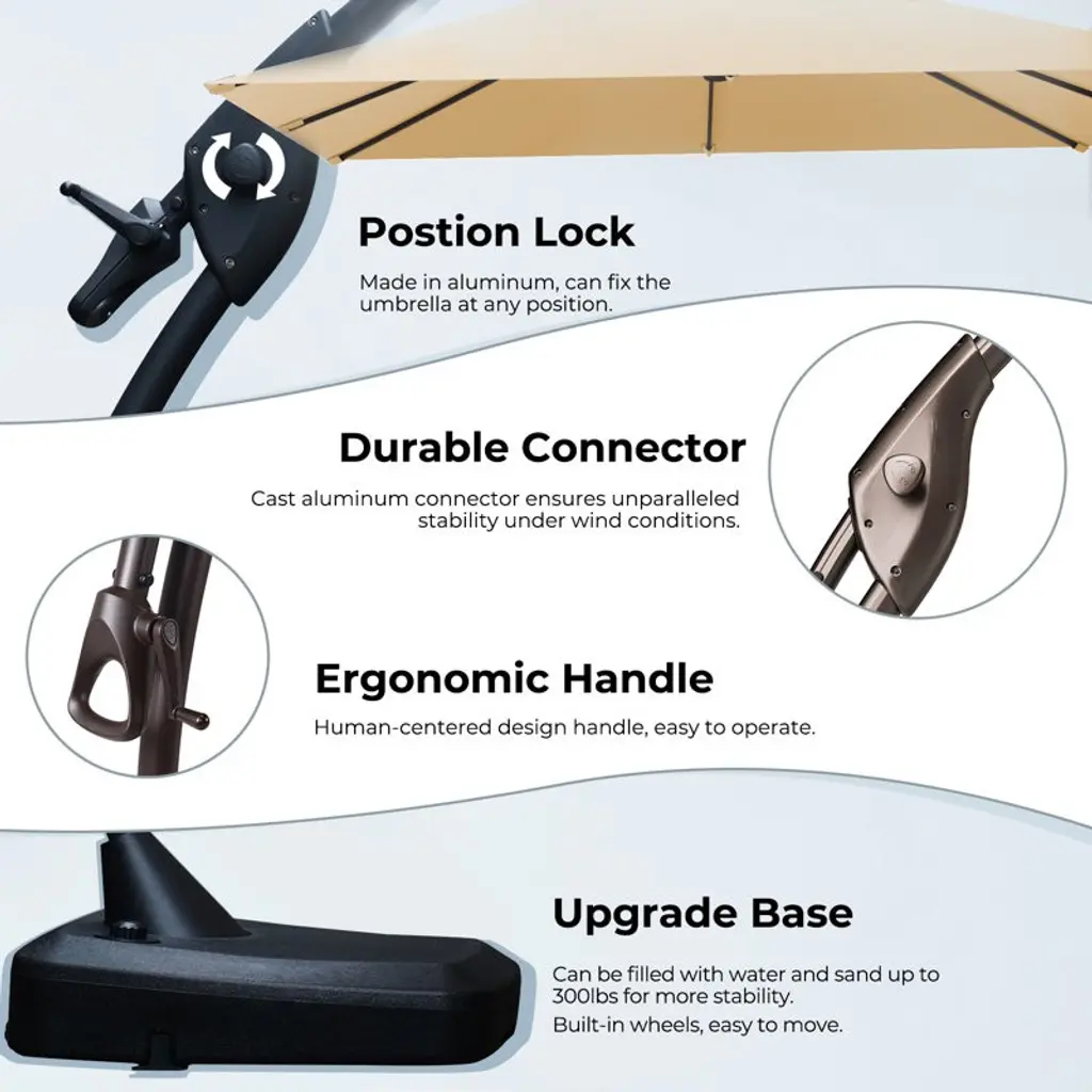 This 10 X 10Ft outdoor offset umbrella is made for home outdoor leisure on the lawn, in the backyard, poolside, deck or dockside, garden, and any other outdoor areas. It's quick and easy to open and close the outdoor patio umbrella with the hand-crank. This cantilever umbrella includes a base -- to fill for weighted stability-- with integrated wheels for easy moving. The square canopy allows multiple umbrellas to be used side-by-side for continuous shade without gaps.