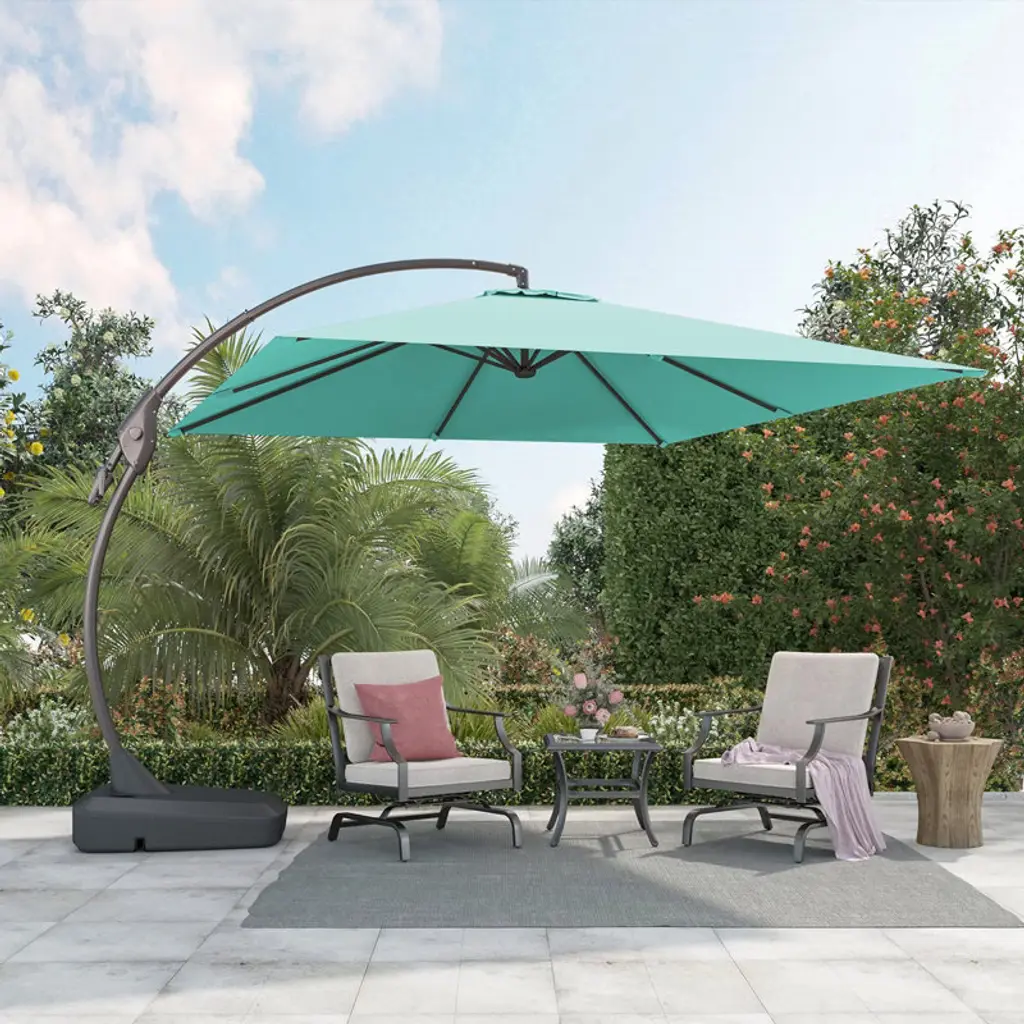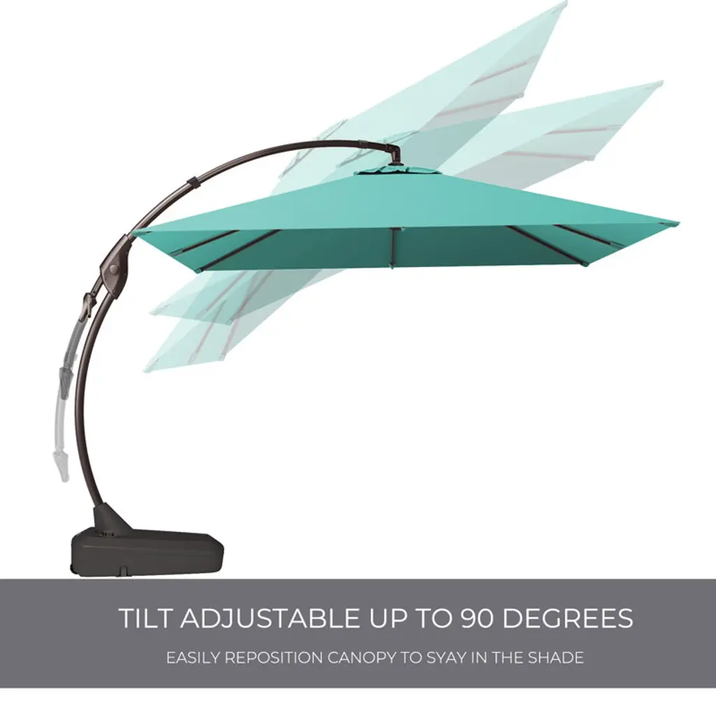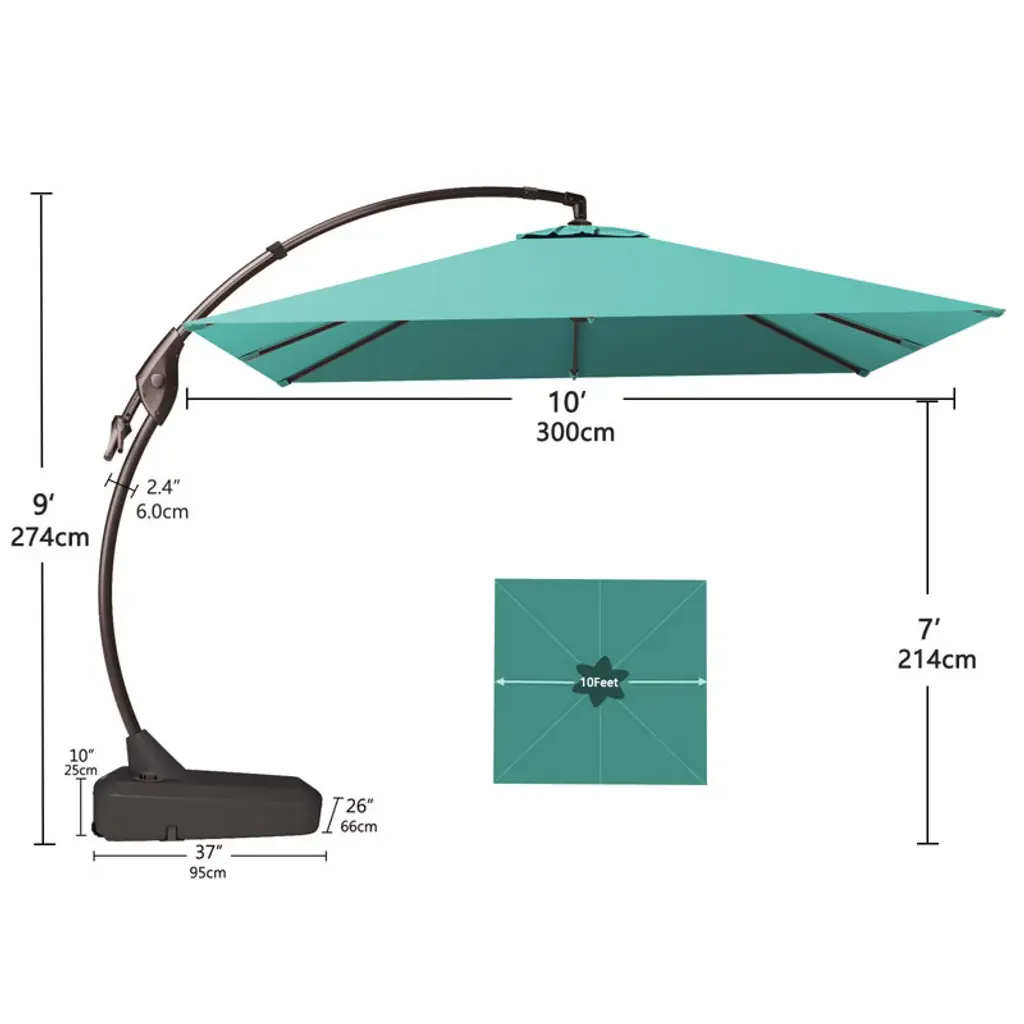 This 10 X 10Ft outdoor offset umbrella is made for home outdoor leisure on the lawn, in the backyard, poolside, deck or dockside, garden, and any other outdoor areas. It's quick and easy to open and close the outdoor patio umbrella with the hand-crank. This cantilever umbrella includes a base -- to fill for weighted stability-- with integrated wheels for easy moving. The square canopy allows multiple umbrellas to be used side-by-side for continuous shade without gaps.