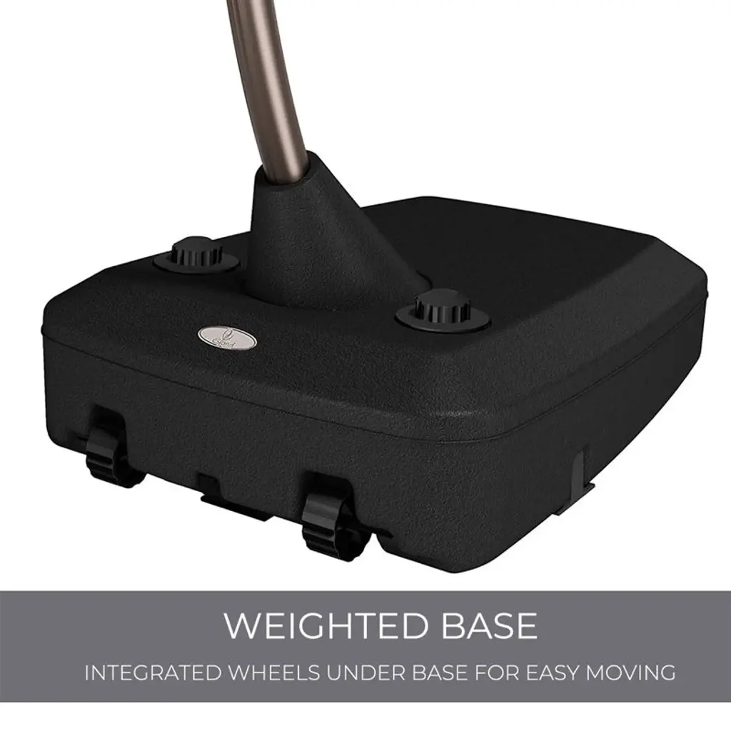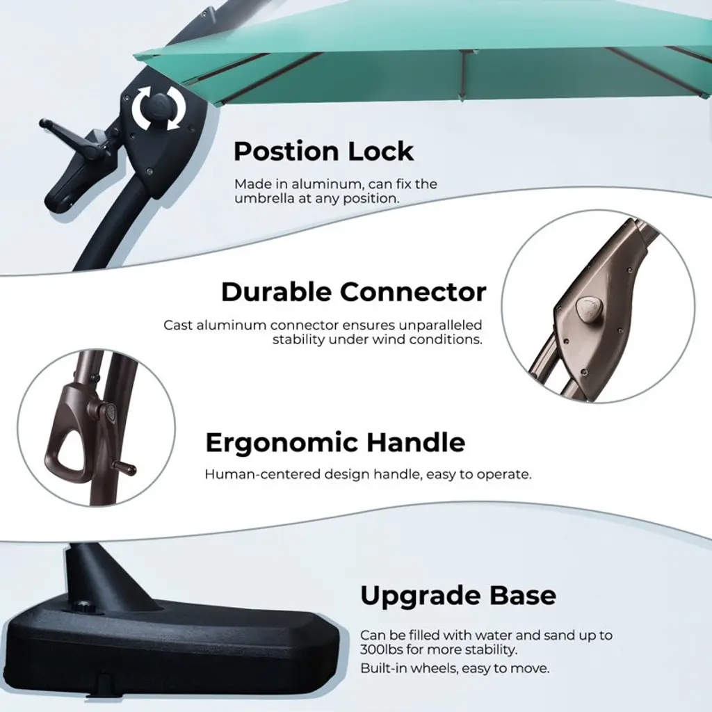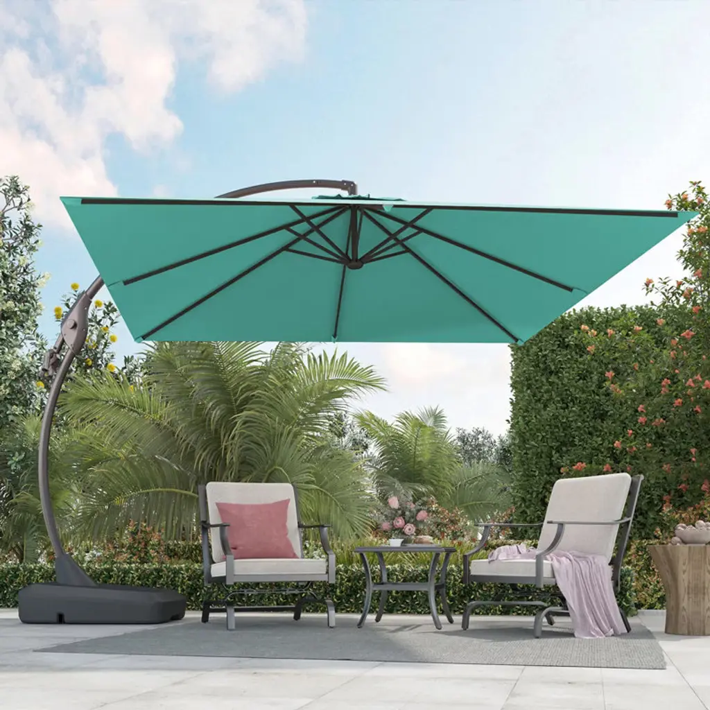 This 10 X 10Ft outdoor offset umbrella is made for home outdoor leisure on the lawn, in the backyard, poolside, deck or dockside, garden, and any other outdoor areas. It's quick and easy to open and close the outdoor patio umbrella with the hand-crank. This cantilever umbrella includes a base -- to fill for weighted stability-- with integrated wheels for easy moving. The square canopy allows multiple umbrellas to be used side-by-side for continuous shade without gaps.