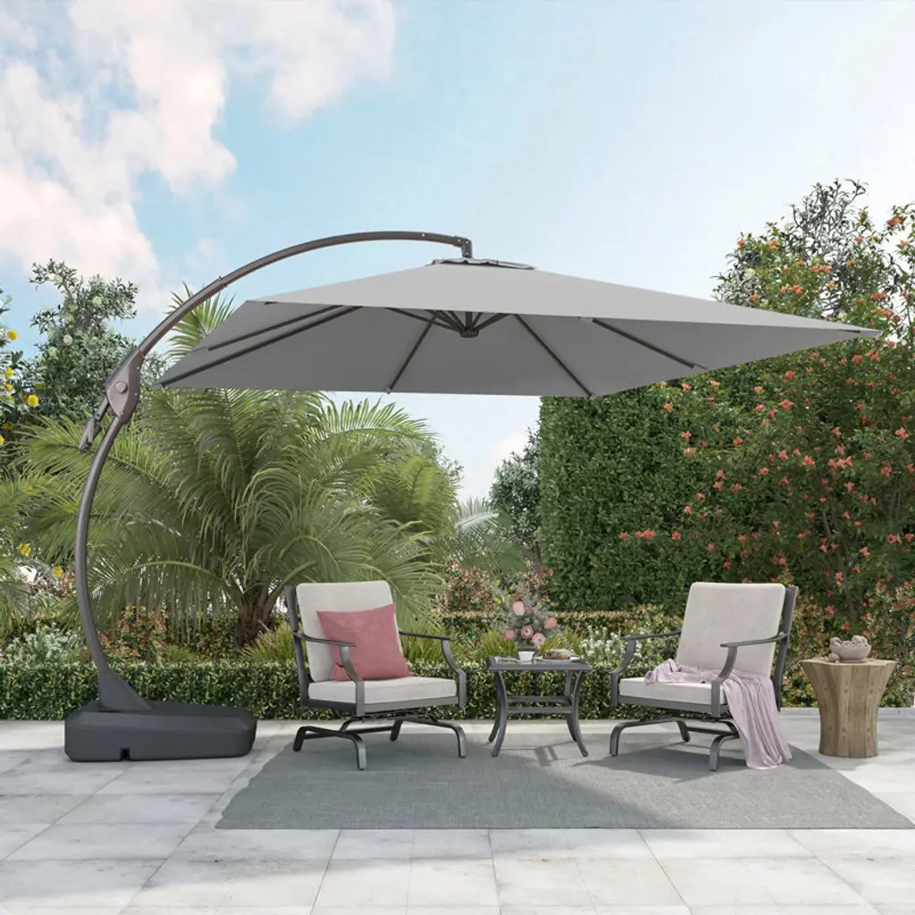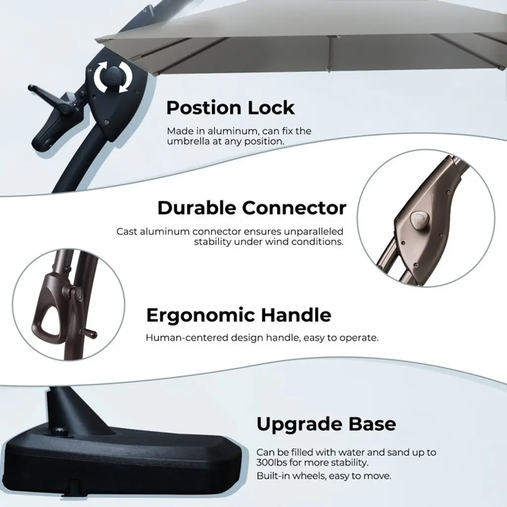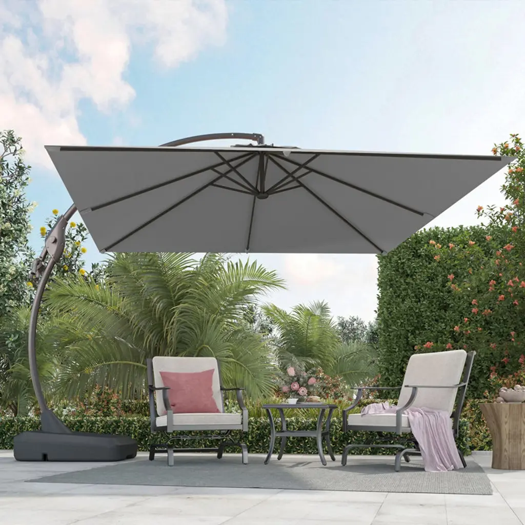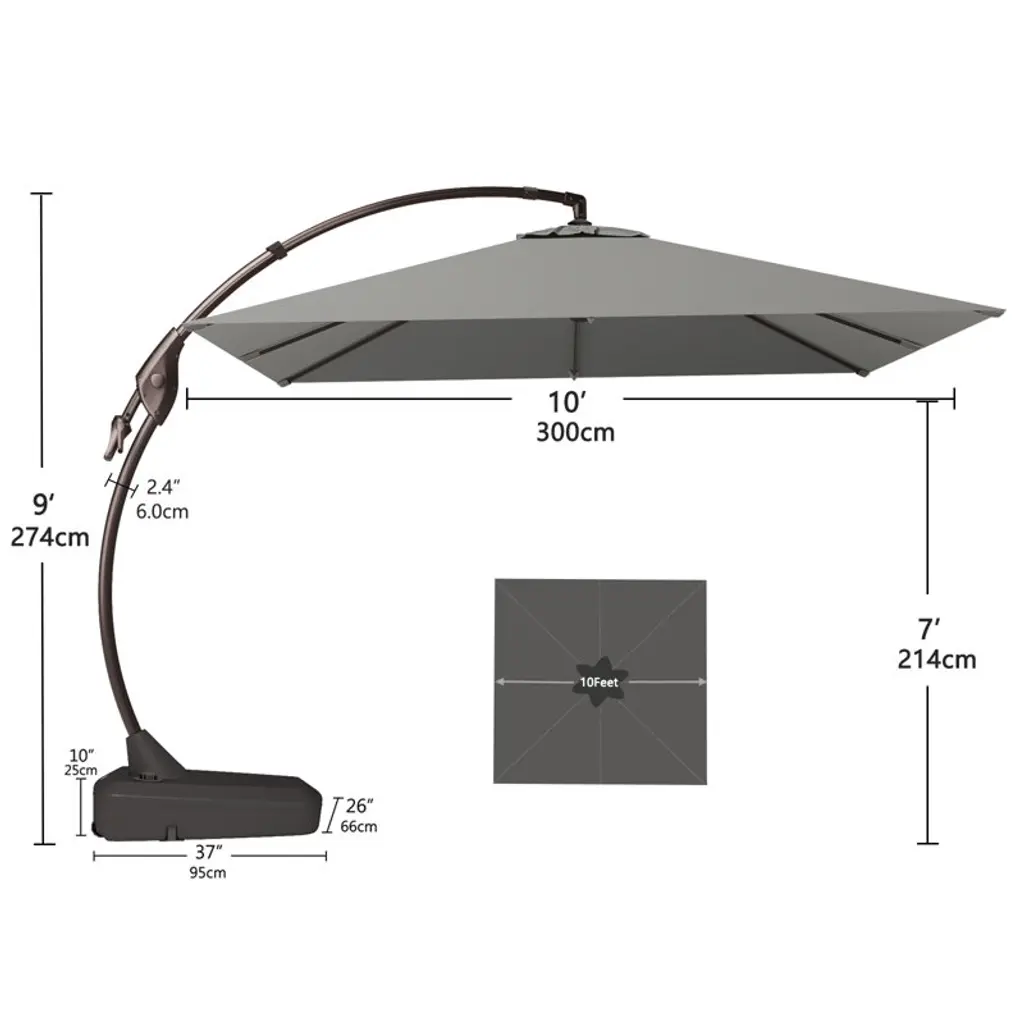 This 10 X 10Ft outdoor offset umbrella is made for home outdoor leisure on the lawn, in the backyard, poolside, deck or dockside, garden, and any other outdoor areas. It's quick and easy to open and close the outdoor patio umbrella with the hand-crank. This cantilever umbrella includes a base -- to fill for weighted stability-- with integrated wheels for easy moving. The square canopy allows multiple umbrellas to be used side-by-side for continuous shade without gaps.