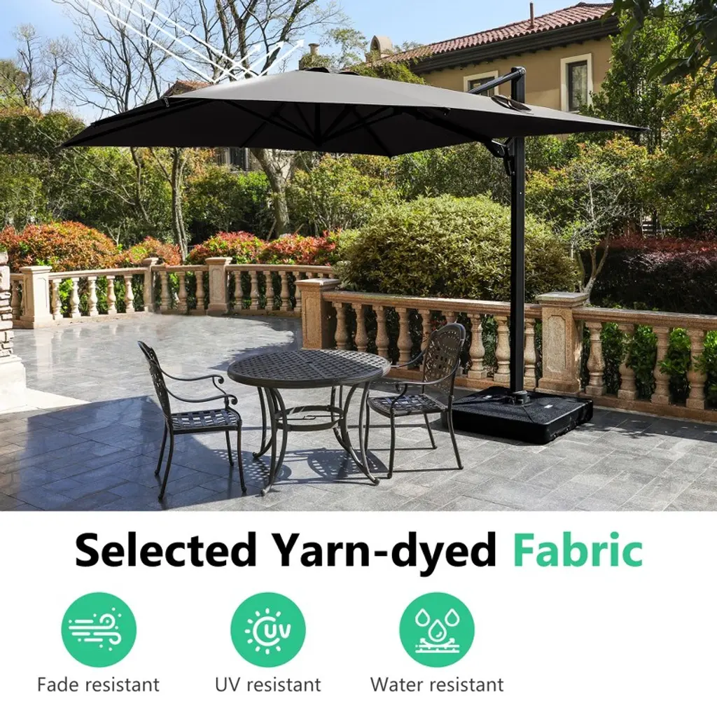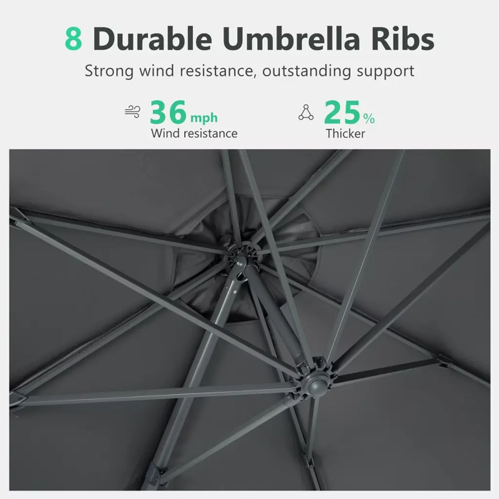 Gulches 10FT square cantilever umbrella features 250g yarn-dyed PU-coated fabric, offering UV protection, water resistance, and 500-hour color fastness (3-year warranty). Adjust height/tilt via handle; 360° rotation with foot pedal for flexible shading. Sturdy aluminum pole + 8 rust-resistant iron ribs. Pairs with a heavy-duty base (not included). Ideal for backyards, pools, patios.