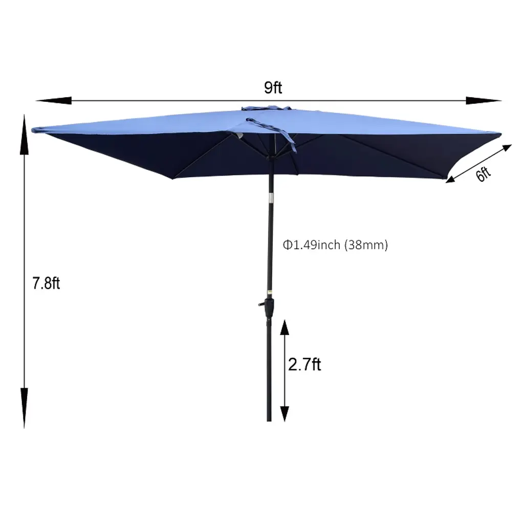 Elevate your outdoor space with the Navy Blue 108-Inch x 72-Inch Rectangular Patio Umbrella, designed to offer both style and functionality. Perfect for gardens, backyards, and poolside areas, this umbrella provides ample shade and a sophisticated look. The intuitive crank system allows for easy canopy adjustments, while the push-button tilt feature offers versatile shade angles to meet your needs. Crafted with a rust-free powder-coated steel pole and six sturdy ribs, this umbrella promises durability and stability. The vented top enhances airflow, ensuring a cool and comfortable environment even on the sunniest days.