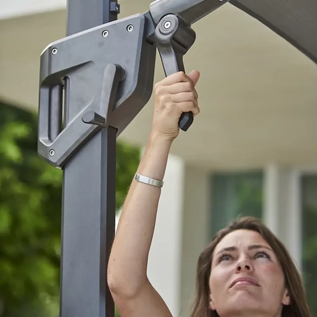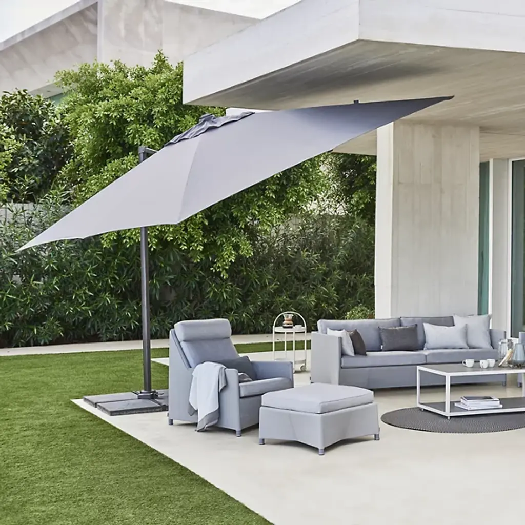 Prepare for the summer months with the Hyde Luxe Tilting Umbrella from Cane-line. Perfect for poolside applications or just the back patio, this large umbrella will provide ample coverage to protect from the summer sun. A tilt mechanism makes it even more versatile, while the sturdy aluminum frame and concrete base (sold separatley) ensure durability against the outdoor elements.