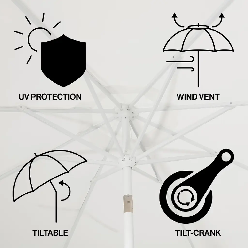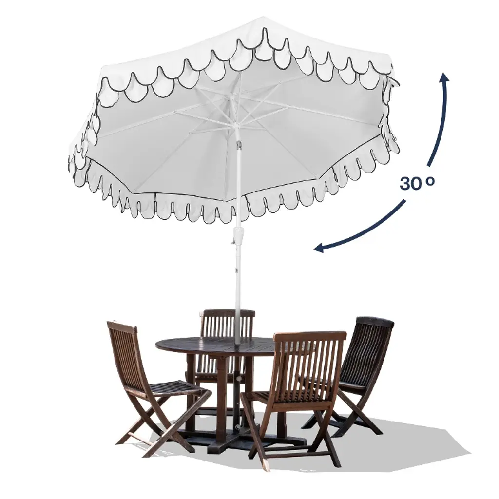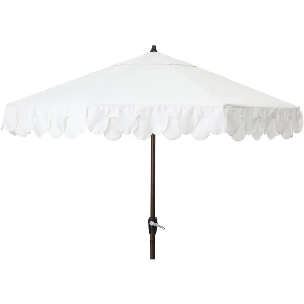 Stir up some midcentury glamor with this classic scalloped umbrella. It features a sturdy aluminum frame covered in durable outdoor canvas, and an auto-tilt mechanism. The double-scalloped edge makes this umbrella chic enough for cocktails around the pool or an outdoor dinner party.