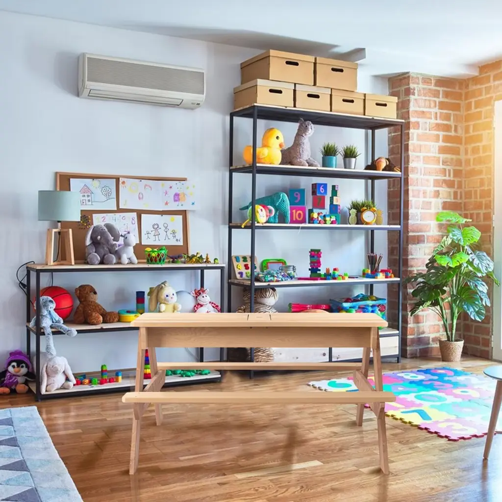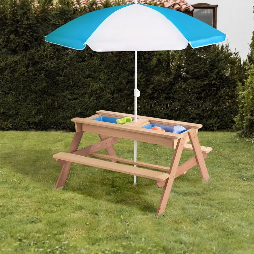 This kids' picnic table has 3-in-1 design, making it multifunctional. It can be a picnic table to put outside or an activity table. Remove the tabletop and you can turn this picnic set into either a sand table or a water table and have more fun with the included sink toys.