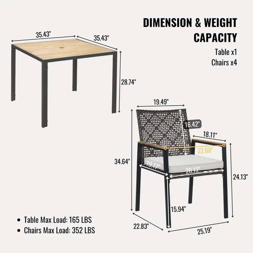 Transform your outdoor living space with the Kumasinova 5-Piece Patio Dining Set, a blend of elegance and comfort designed to enhance your garden, balcony, or backyard. Featuring a sturdy, powder-coated frame paired with high-quality PE rattan and a solid acacia wood table top, this set is both durable and aesthetically pleasing. The coffee brown rattan and sustainable solid acacia wood bring a natural look to your space, making it a perfect addition to any outdoor decor.The set includes four ergonomic chairs with armrests made from acacia wood and 1.96-inch thick foam-padded cushions for ultimate comfort. The chairs support up to 352 lbs, ensuring stability for all guests. The 35.43" square table features an umbrella hole, making it easy to enjoy sunny outdoor meals with added shade from a parasol. Built to withstand outdoor elements, this set is weather-resistant and made with UV-tested cushion covers, anti-rust frames, and a water-based oil finish on the wood. With easy assembly, you’ll be able to create a cozy outdoor dining area to enjoy with family and friends.