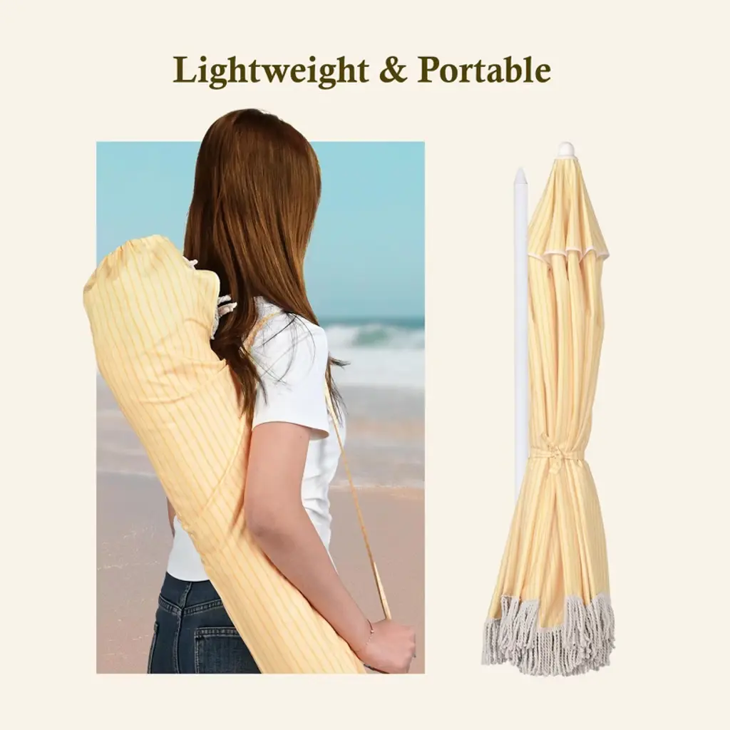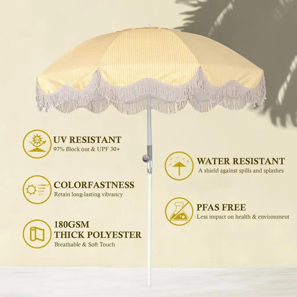 Features:- Yellow Striped Fringe Umbrella - Patio Umbrella with cotton fringes features yellow-and-white stripes to evoke a playful elegance, bringing a sunbeam warmth to beaches, balconies, decks, gardens, outdoor picnics, alfresco restaurants, etc.- UV Protection - Canopy with UV30+ protection blocks 97% of harmful sunrays, and is colorfast up to European Standard Level 4 for prevent fading- Sustainable Fabric - Crafted from PFAS-free polyester, the fabric ensures great breathability, wear-and-tear resistance while greatly reducing impact on nature- Easy to Open & Tilt - No rope and pulley, just push and pop it open; Features a button tilt mechanism that allows elegant ladies to effortlessly adjust the shade angle without hassle- Versatile Use - Umbrella pole with a mounting spike can be directly stuck into sand, beach or glass for securing, or be used in conjunction with an umbrella base, making it ideal for beach sunbathing, picnics with friends, and family time outdoorsSpecifications:- Overall Dimension(LxWxH) 70 7/8" x 70 7/8" x 82 5/16" (180 x 180 x 209 cm)- Pole Diameter 1 1/4" (3.2 cm)- Fringe Length 4 1/2" (11.5 cm)- Material Metal Pole, Fiberglass Ribs, 180gsm Polyester- Net Weight 6.4 Lbs (2.9 kg)Package Contents:- 1x Patio Umbrella- 1x Carrying Bag- 1x ManualNotice: - It is recommended that you tilt the umbrella at an angle up to 15 degrees.
