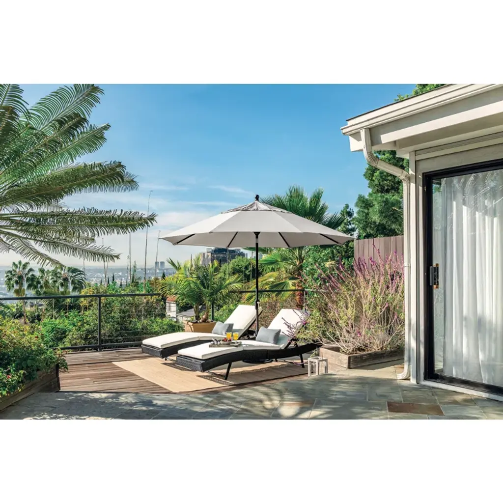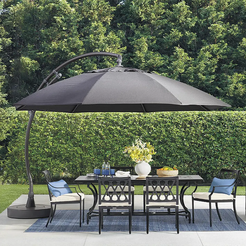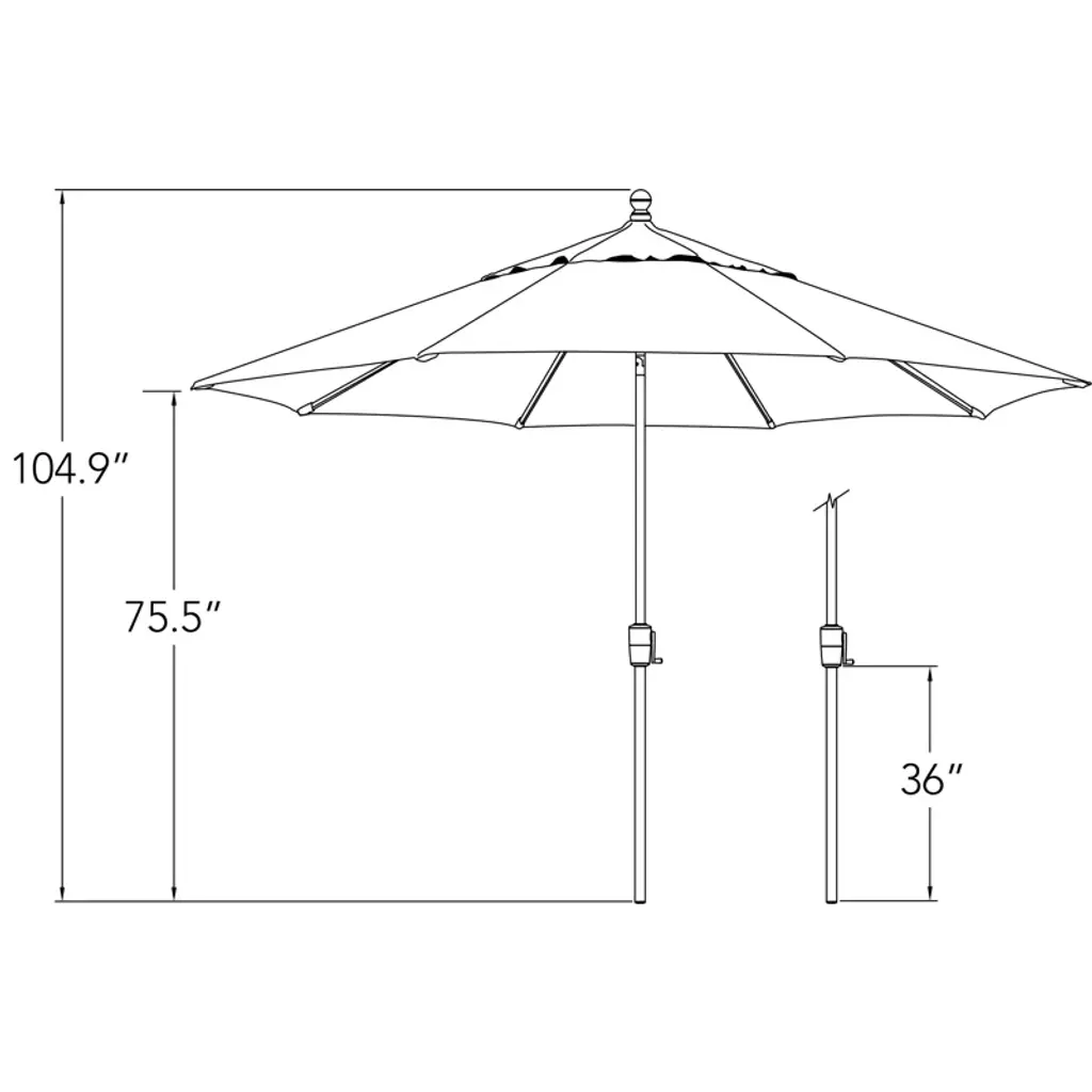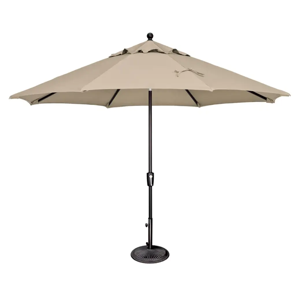 Create a shady outdoor oasis on your porch or patio with this 11' market umbrella. It's crafted from aluminum with a solid finish, and it rests on a round stand. This umbrella features an octagonal canopy crafted from water- and fade-resistant Sunbrella fabric in your choice of pattern, while eight ribs extend out via a crank lift on the pole. A vent on top lets fresh air flow, while sewn-in hook and loop fasteners keep the umbrella closed when not in use. Plus, we love that this umbrella provides UPF 50 protection from strong UV light.