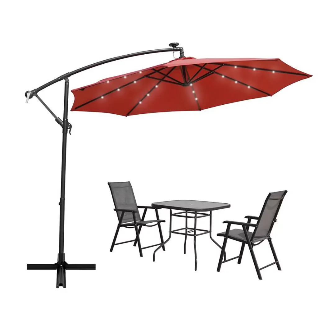 Enjoy being outdoors without the sun blasting down on you as you sit underneath this Willry Cantilever Umbrella. The Umbrella has 24 LEDs on the umbrella ribs to light up your patio. This umbrella is perfect for hanging over outdoor dining tables, hammocks, deep seating patio furniture sets, and more. Each umbrella has a durable steel pole and 8 steel ribs. The solar panel will keep the lights on without having to connect to power. The ribs made of powder-coated steel are rust-resistant and strong enough to handle regular wind and rain It's perfect for gardens, balconies, decks, swimming pools, or cafes. Please note, that a heavy base is necessary to place on the cross base to keep this umbrella securely in place (not included, must be purchased separately). Product Dimensions Umbrella: 96.46" H x 118" W x 118" D Pole Diameter: 1.89"