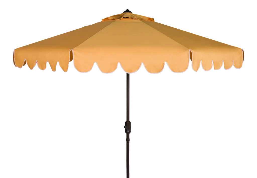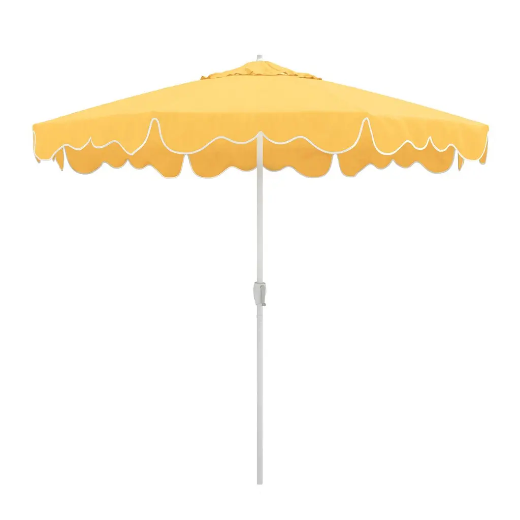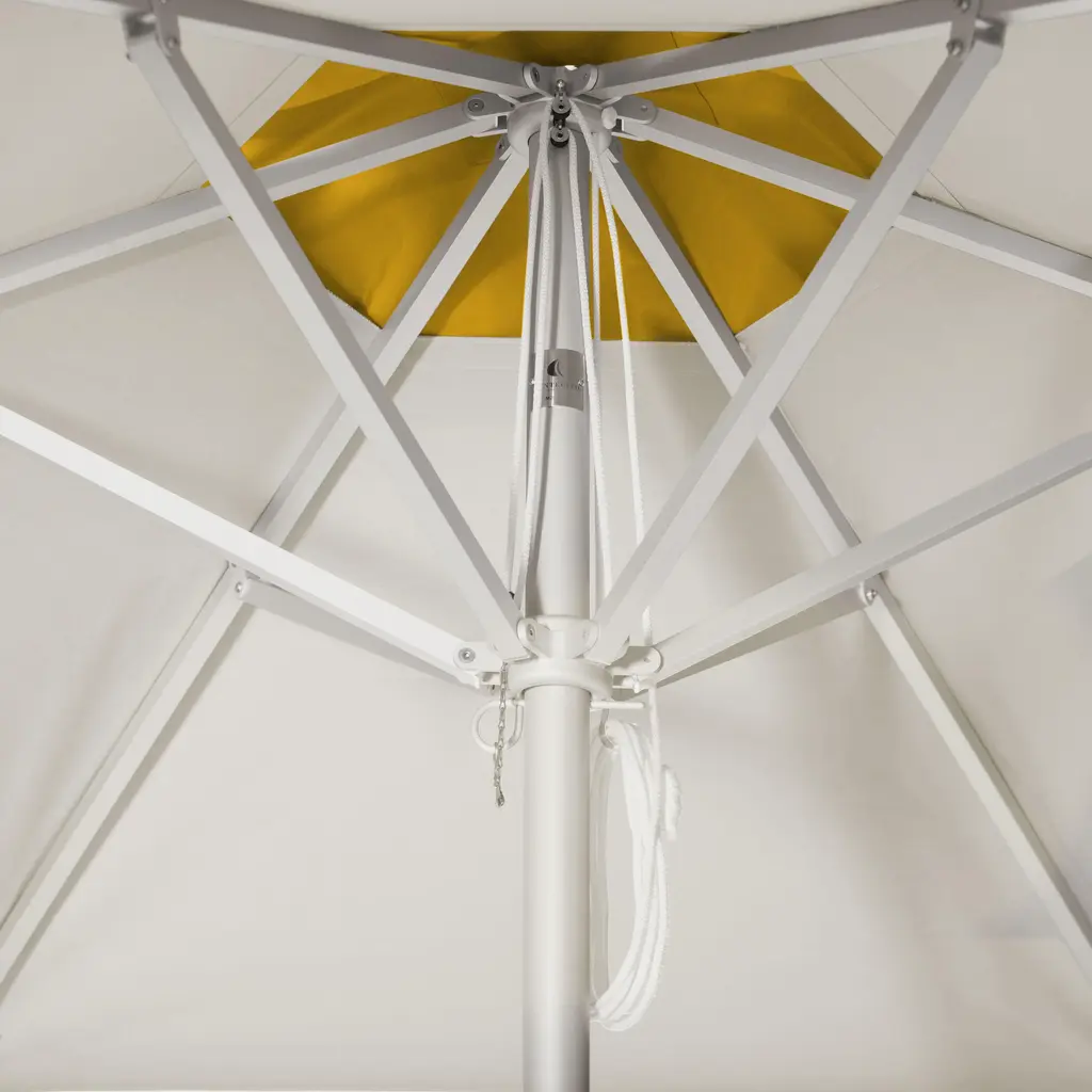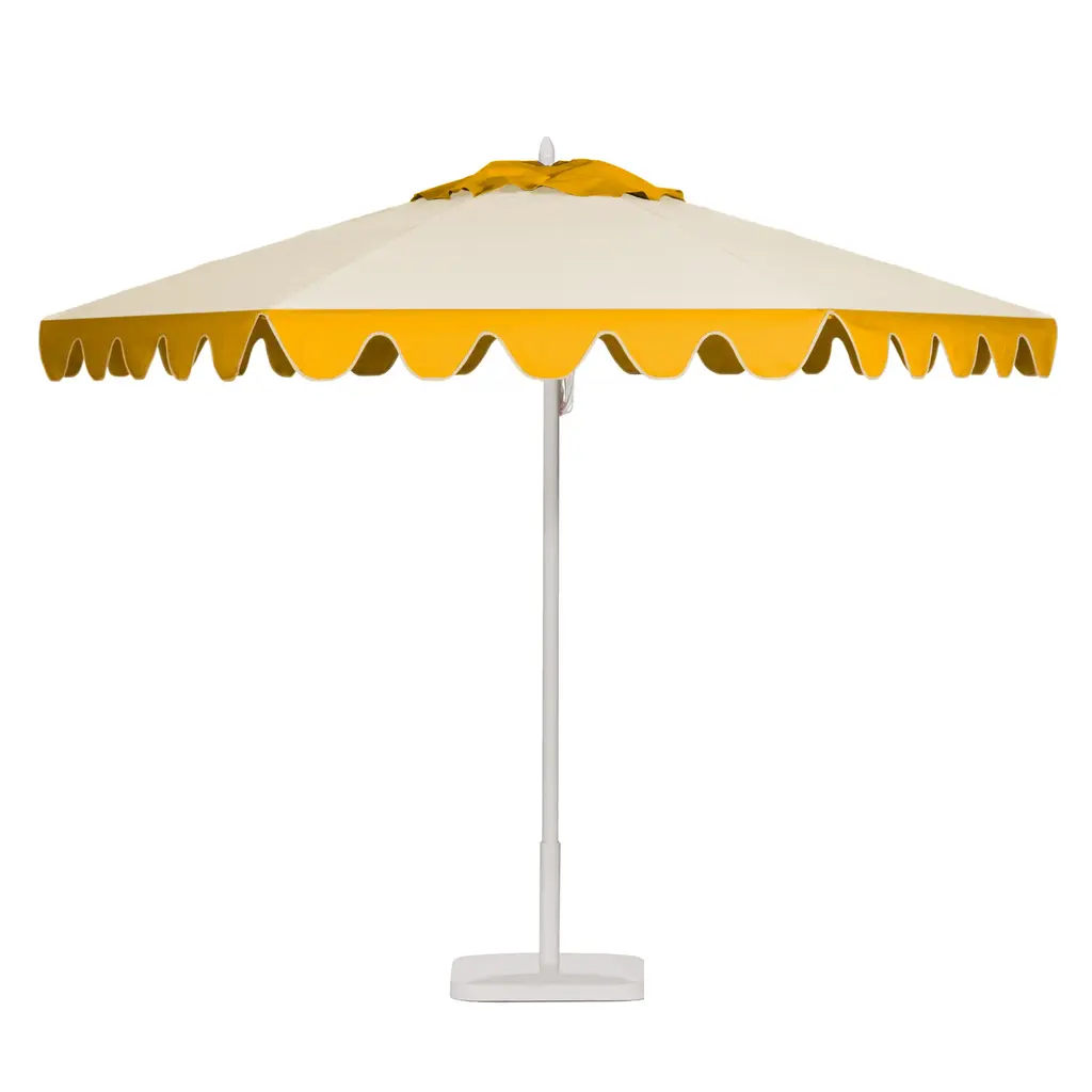 The Lemon Frappe Market Umbrella is a 9' Hexagon in solid aluminum powder coated Eggshell. The umbrella's main canopy is fabricated in Whipped Cream, with scalloped valance and wind vent in Cornsilk, and finished with Linen braid trim. Solid aluminum hubs, finial and fittings are used, for the ultimate balance in strength and refinement. The Eggshell base is constructed of powder coated aluminum over cement, and features hidden side rollers for repositioning. Benchmade in America at the California Coast. The 9-foot hexagon is suitable for a couple of lounge chairs or chaises, also a four top table.