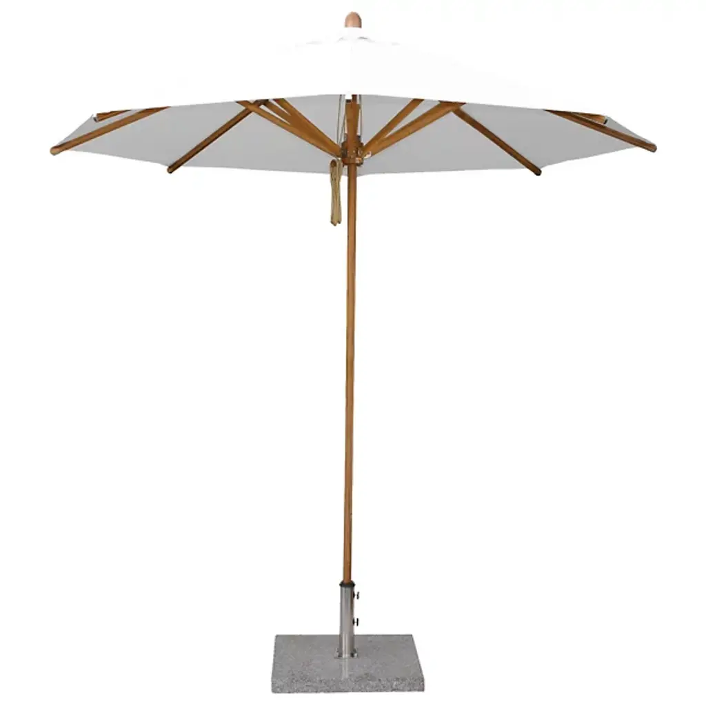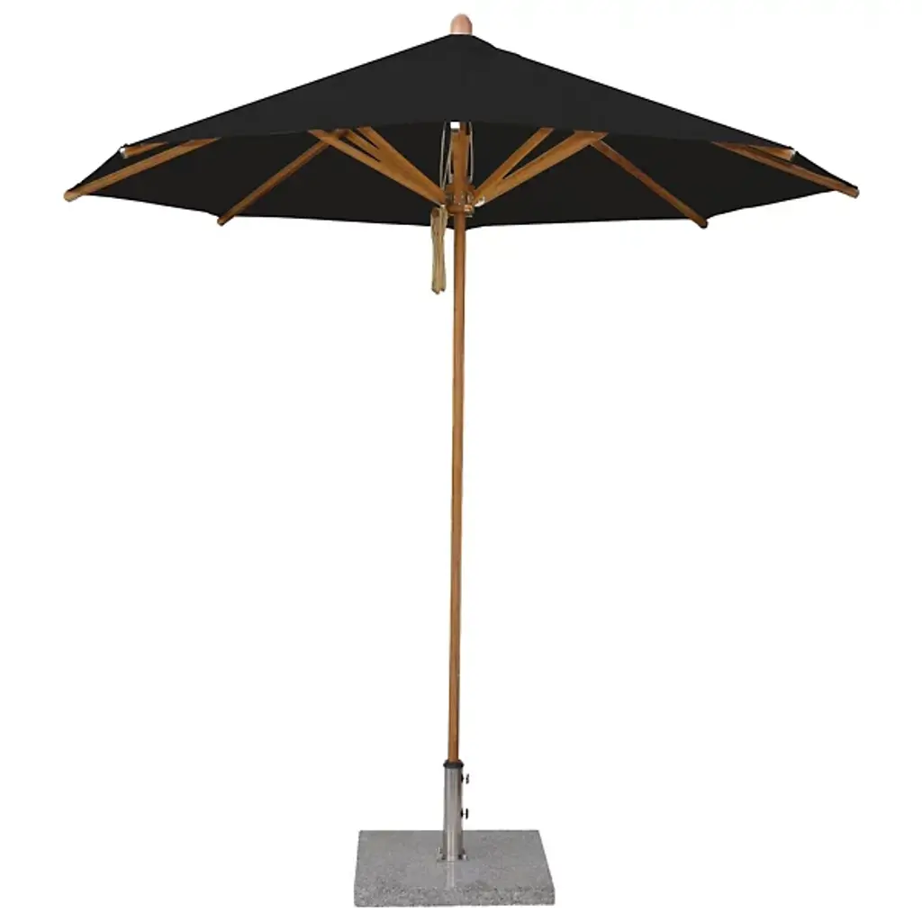 Cast a spot of shade with the wide-reaching and tasteful Levante Round Bamboo Umbrella by Bambrella. A sleek, contemporary assembly of bamboo and stainless steel, it uses a sturdy square base to suspend a single-piece pole heading up to a broad round canopy supported by bamboo arms for added strength and flexibility. The hub and runner are also made from turned bamboo and use a dual pulley system to lower and raise with ease.