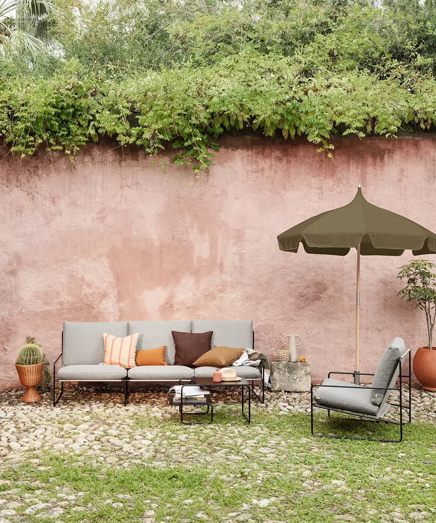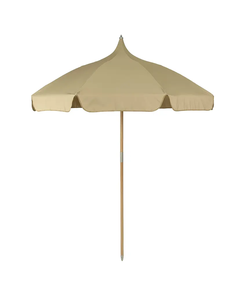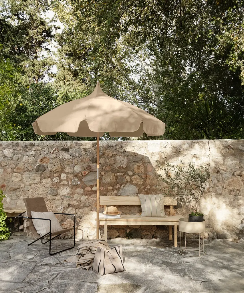 Working as a shield for summer's relentless heat, the Lull Umbrella calls for relaxation and serenity in the shade. With its romantic pagoda shape and FSC-certified wooden stem, the large outdoor umbrella is ideal for garden picnics, the beach, and everywhere else where you need shelter from the sun. The Lull Umbrella gives UV30+ protection and comes in a handy, matching bag to make transportation easier. Designed and produced by the Copenhagen-based studio Ferm Living.