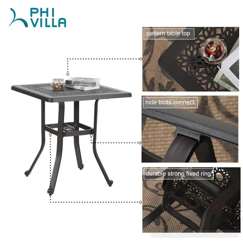PHI VILLA 27.5" cast aluminum bistro square dining table. With the broad square back, you will feel like hugged by the bistro table and you can stretch yourself as you wish on this bistro table. It is perfect in the indoor, outdoor. It will enhance your outdoor living space!
