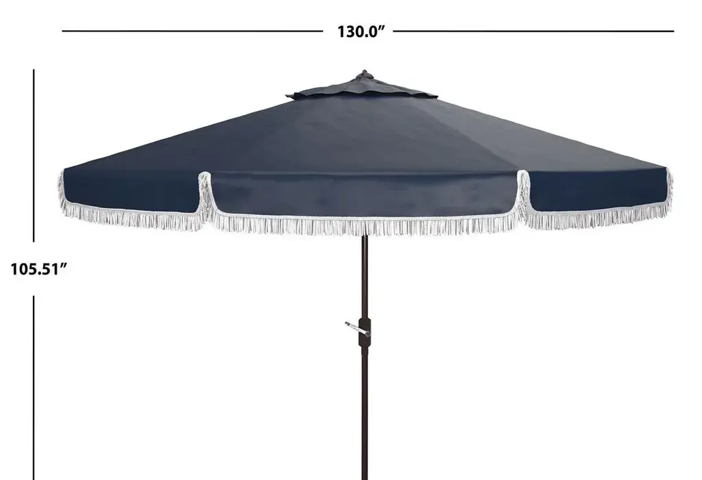 Summer afternoons at Mayfair’s private member’s club inspired this posh eleven foot crank umbrella. Its classic navy fabric is paired with white fringe for a touch of whimsy and exotic style. Ideal for cocktails by the pool or afternoon delights. Open Dimensions: 130" x 105.51" Closed Dimensions: 6.1" x 105.51" Care Instructions: Store outdoor furniture indoors or cover well when not in use. Remove wooden furniture from standing water. Dust regularly with small brush or vacuum. Spills should be taken care of immediately before they harden or stain with a slightly dampened sponge. Do not use bleach solutions.
