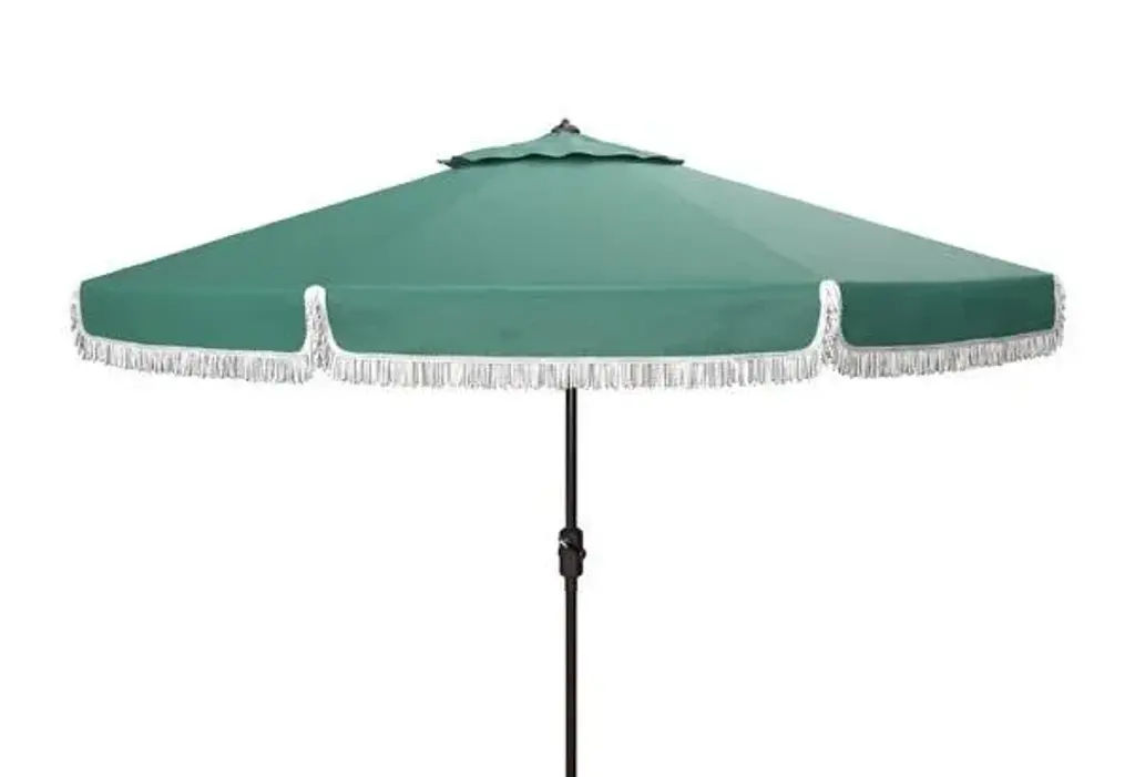 Summer afternoons at Mayfair’s exclusive private member’s club inspired this posh nine-foot crank umbrella. Its hunter green fabric is paired with white fringe for a touch of whimsy and exotic style. Ideal for cocktails by the pool. Store outdoor furniture indoors or cover well when not in use. Remove wooden furniture from standing water. Dust regularly with small brush or vacuum. Spills should be taken care of immediately before they harden or stain with a slightly dampened sponge. Do not use bleach solutions. Assembly Required? Yes CLOSE: 6.1"W x 6.1"D x 98.82"H Materials: Aluminum, Polyester