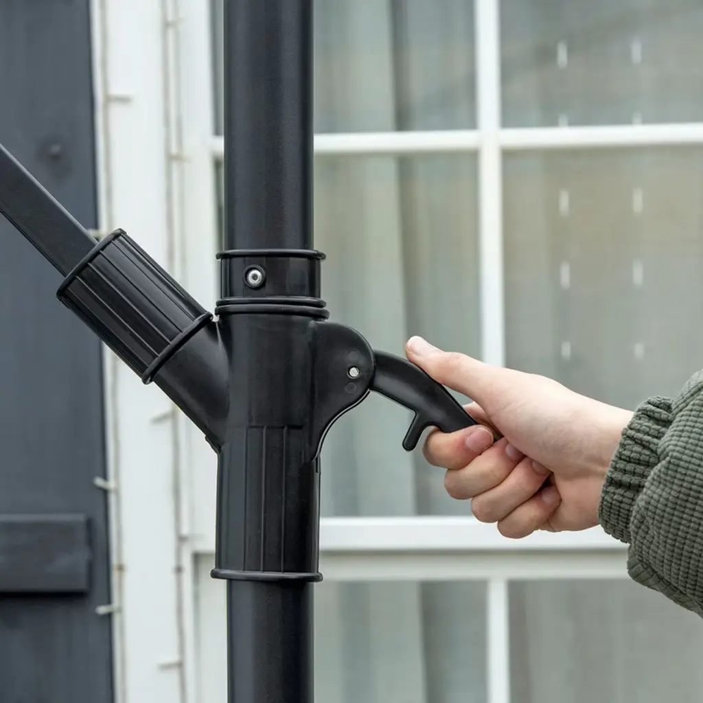 Outside Umbrella with Cross Base: Our deck umbrella for patio can cover patio furniture that doesn't have a hole for a standard umbrella. Have more usable space and provide shade in difficult situations when you cover sectionals, pool chairs, or patio dining sets. Summer Shade: Down on your deck, put on your porch, brought to your backyard or balcony this porch umbrella provides soothing shade throughout the summer. Perfect for picnics, parties, barbecues, and more. Enjoy eating with friends, having conversations, and having fun without going indoors to get out of the sun. Easy Open Crank: Is the glare too much to bear? Scared you might get a sunburn? Outdoor shade is close at hand. Use the included hand crank on the pole to easily open and shut your patio umbrella Made with Outdoor in Mind: Our backyard umbrella with base features a vented canopy that helps it stay stable against the wind. Also, it's made of outdoor-ready 180gsm polyester fabric and a strong steel frame that's been powder coated to make it withstand water. Patio Offset Umbrella Info: Umbrella Diameter: 116.25" Dia. Umbrella Height: 76.5" H. NOTE: Required at least 154 lbs. weight (not included). Do not use umbrella during extreme weather (strong wind, heavy rain, snow).