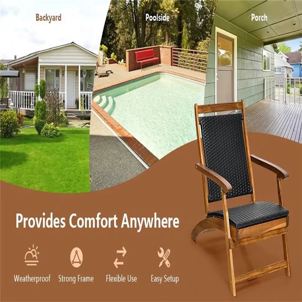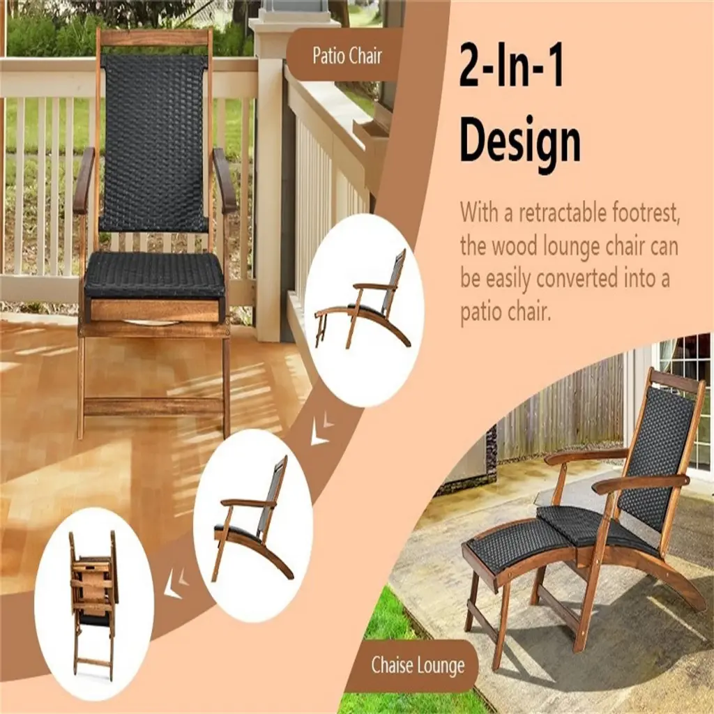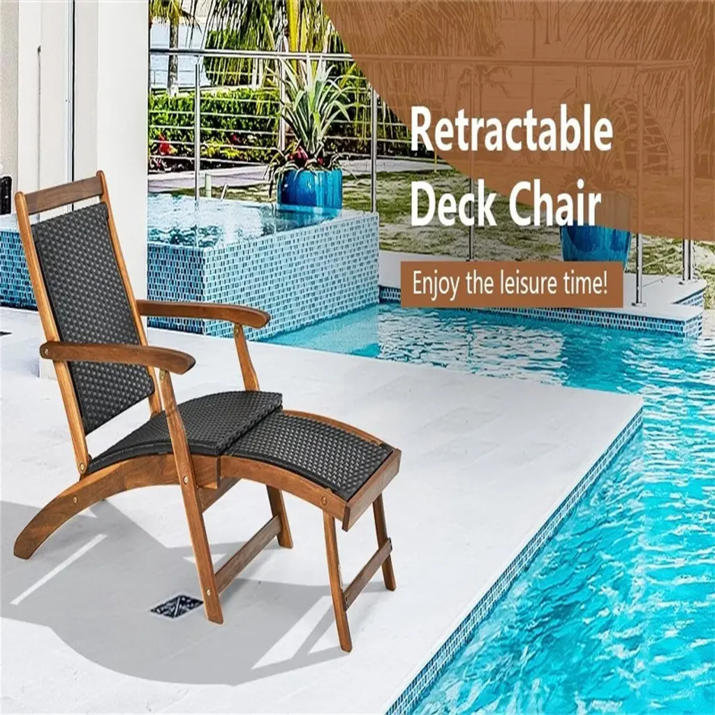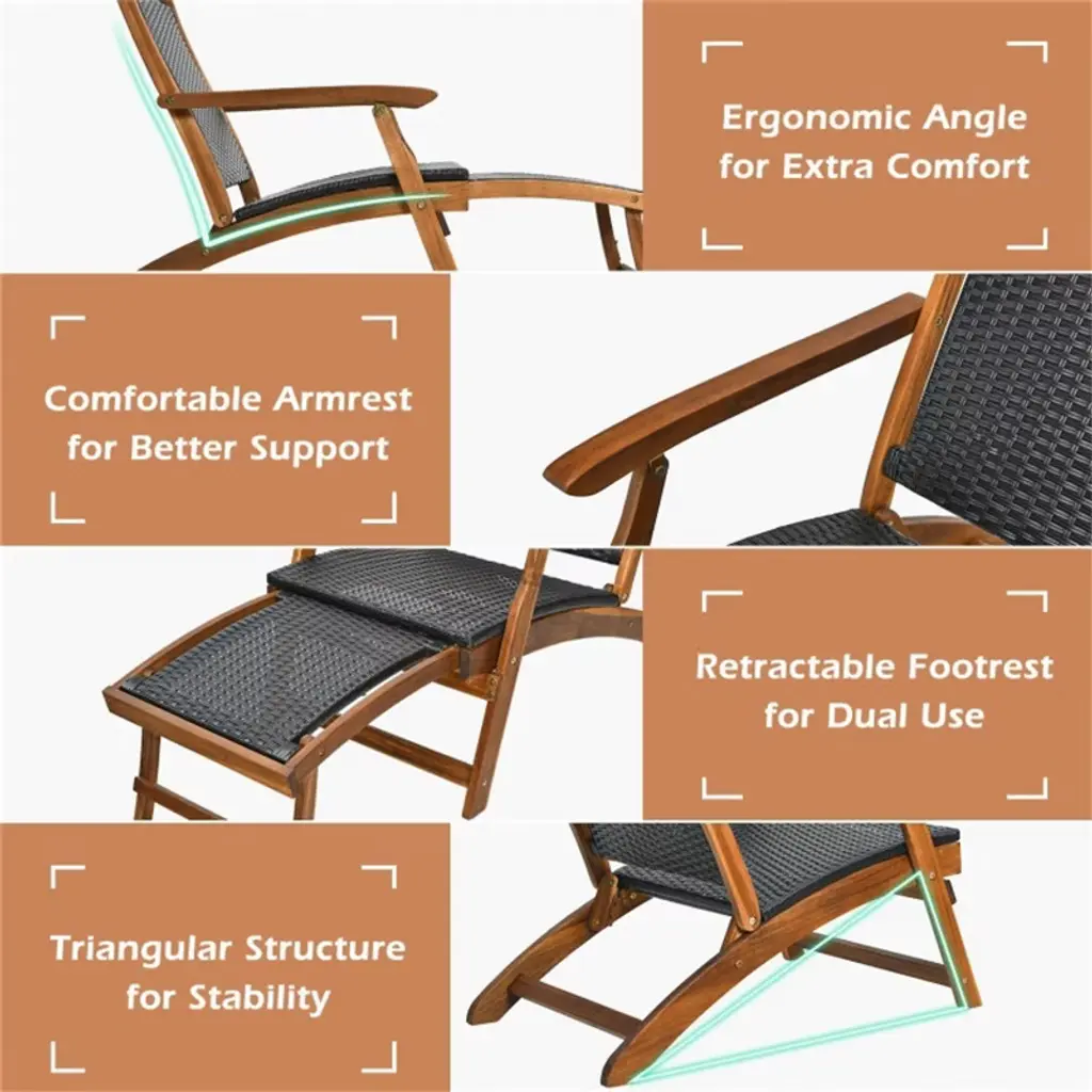 ¡ñ Rugged and Stable Wood Frame:?Made of premium acacia wood frame, the patio deck chair is quite sturdy and not easy to deform. Weather-resistant PE rattan features good breathability and has the ability to withstand the test of time. Besides, the lounge chair is strong enough to support up to 360 lbs.¡ñ Free Change and Charming Style:?Vary from other common lounge chairs, the footrest can be easily folded under the seat, so you will have a lounge chair and a single chair at the same one. With concise and rustic design, this deck chair will add a touch of elegance for your outdoor occasions including patio, courtyard or porch.¡ñ Ergonomic and Comfortable Seat:?The lounge chair allows you to sit in the chair comfortably for longer periods of time. In addition, sloping backrest perfectly fits your body curve and relax your back completely when you lean on it, which brings ultimate comfort to the users.¡ñ Folding Design for Easy Storage:?The retractable footrest can be easily folded into a compact size for convenient storage and saving space, making it easy to move from one place to another. The lockable hasp keeps the deck chair stable and won't spread out during the process of transportation.¡ñ Hassle-free Assembly:?The smooth surface is easy to clean and maintain that only need to be lightly wiped with a cloth. Besides, this deck chair is easy to expand and fold without any tools and put together according to instruction. Overall dimension: 24" x 51.5" x 32.5"(L x W x H), folding size: 45.5" x 22.5" x 11" (L x W x H)