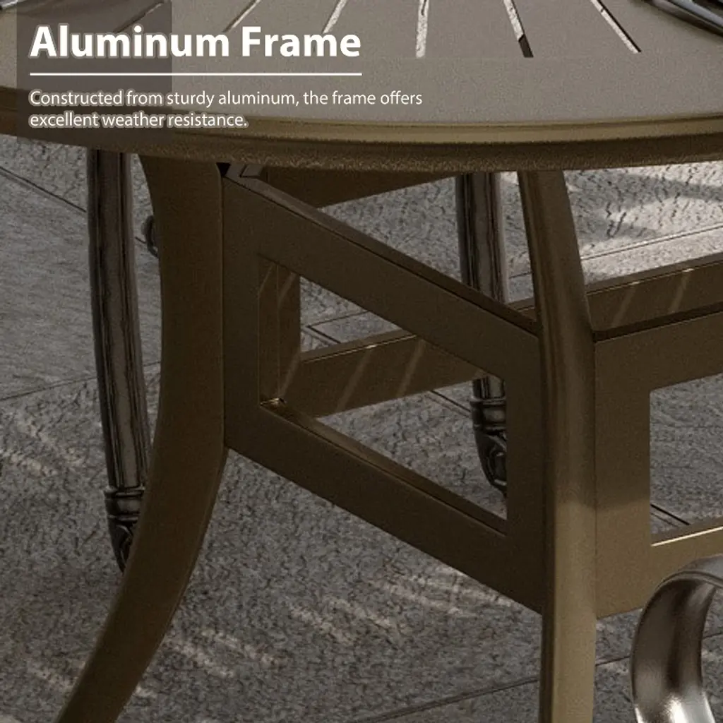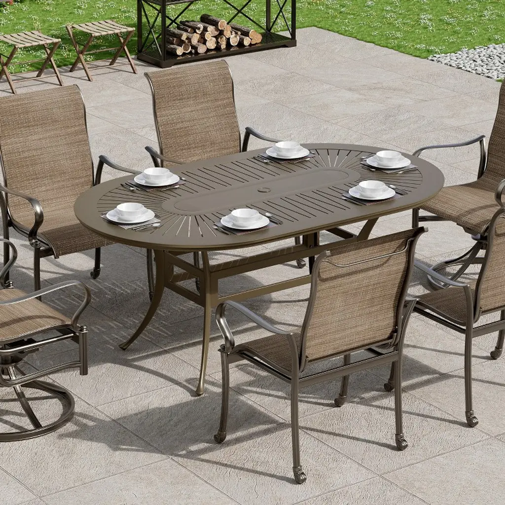 Relax and enjoy a meal under the stars with the oval 72" x 42" Dining Table. Crafted from sturdy cast-aluminum with a powder-coated finish, this dining table features an intricate design on its tabletop with an umbrella hole. Sure to be a focal point this table can be paired with chairs or join an eclectic mix of furniture on your patio or deck.