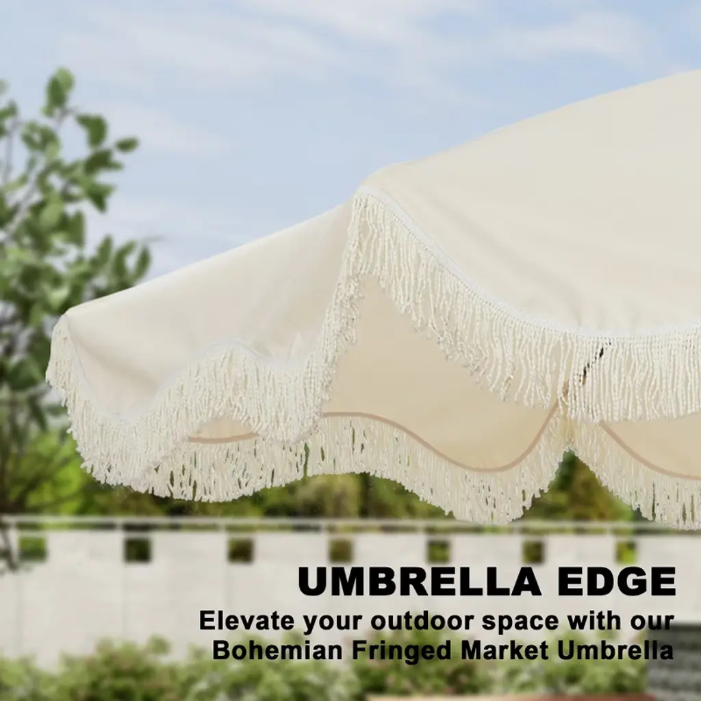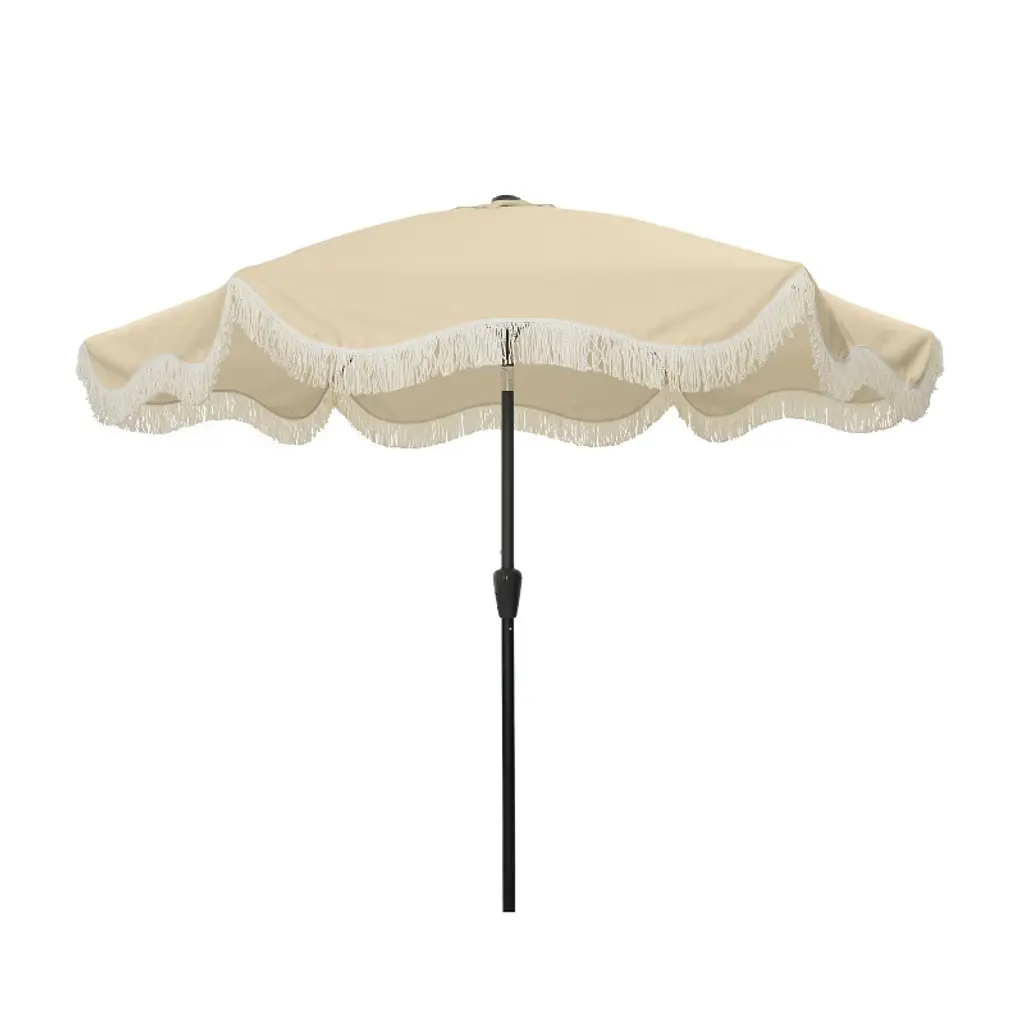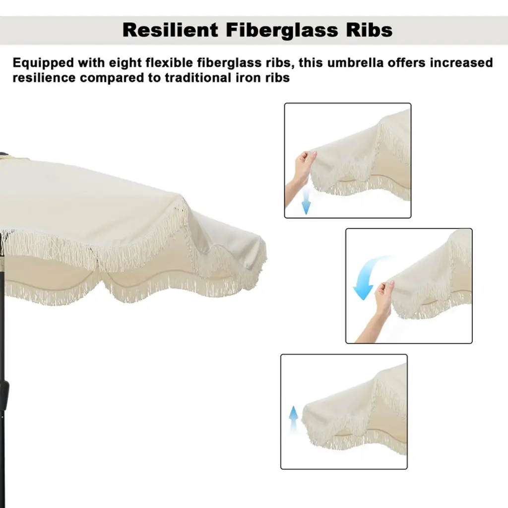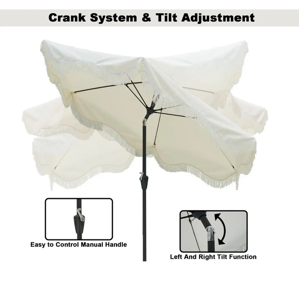 Mondawe 9 Ft. Crank Design Bohemian Tassel Style Outdoor Market Umbrella With Full Fiberglass Rib Tan