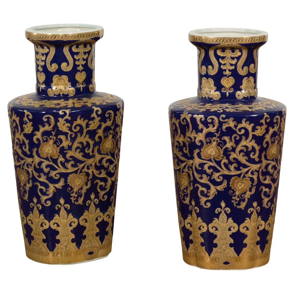 The bold, imposing size of this superb vase will make it the stand-out element of a spacious living room or entryway as an umbrella holder. The vase's handcrafted ceramic silhouette is decorated with a technique developed by Sambuco that recalls mosaic tiles by engraving a multitude of small tile shapes onto the ceramic. The ornate motifs draw inspiration from the lavishness of Byzantine artifacts and are adorned with precious gold for an opulent effect. A third firing fixes the color on the ceramic