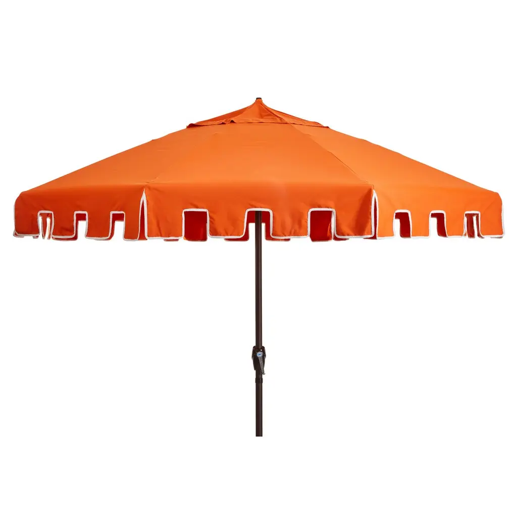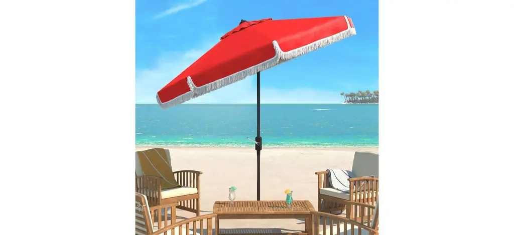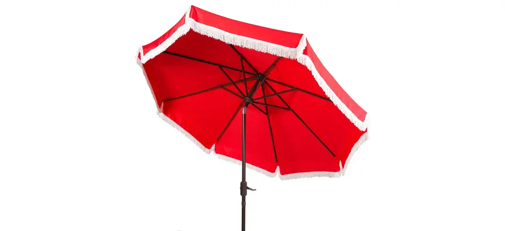 Summer afternoons at Mayfair's exclusive private member's club inspired this posh nine foot crank umbrella. Its classic red fabric is paired with white fringe for a touch of whimsy and exotic style. Ideal for cocktails by the pool or afternoon delights.