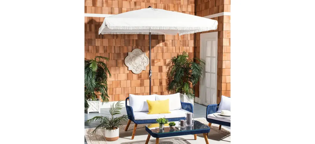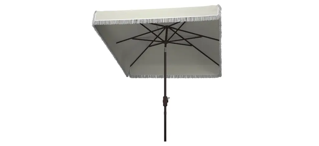Summer afternoons at Mayfair's exclusive private member's club inspired this posh square crank umbrella. Its classic white fabric is paired with matching fringe for a touch of whimsy and exotic style. Ideal for cocktails by the pool or afternoon delights.