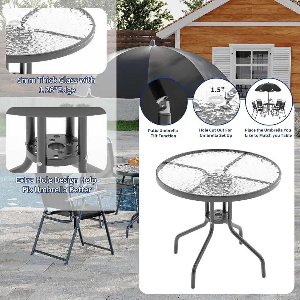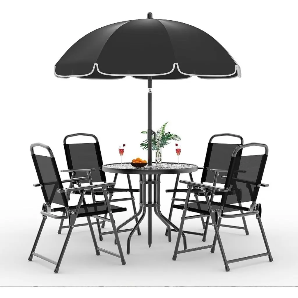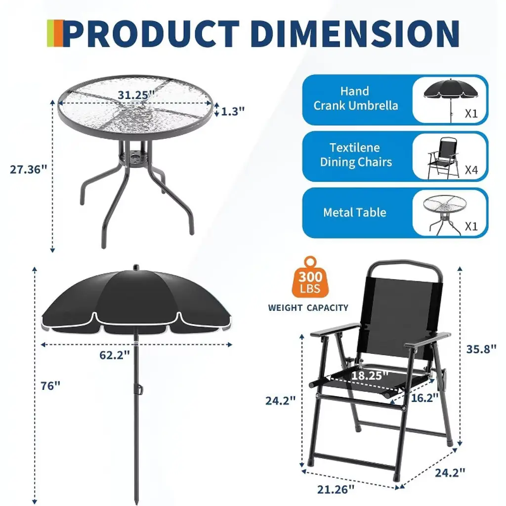 Create the perfect outdoor dining space with the Nasitip 6-Piece Patio Set! This stylish hexagonal set includes a 31.25" tempered glass-top table, 4 folding chairs with breathable Textilene fabric, and a tilt-adjustable umbrella for sun protection. The powder-coated stainless steel frame resists rust, while the 5mm rippled glass tabletop is both durable and easy to clean. Lightweight yet sturdy (58.38 lbs), this set is ideal for patios, poolside, or decks. Chairs fold for compact storage, and protective floor glides prevent surface damage. Enjoy comfortable, shaded outdoor meals with this versatile khaki/blue/black set!