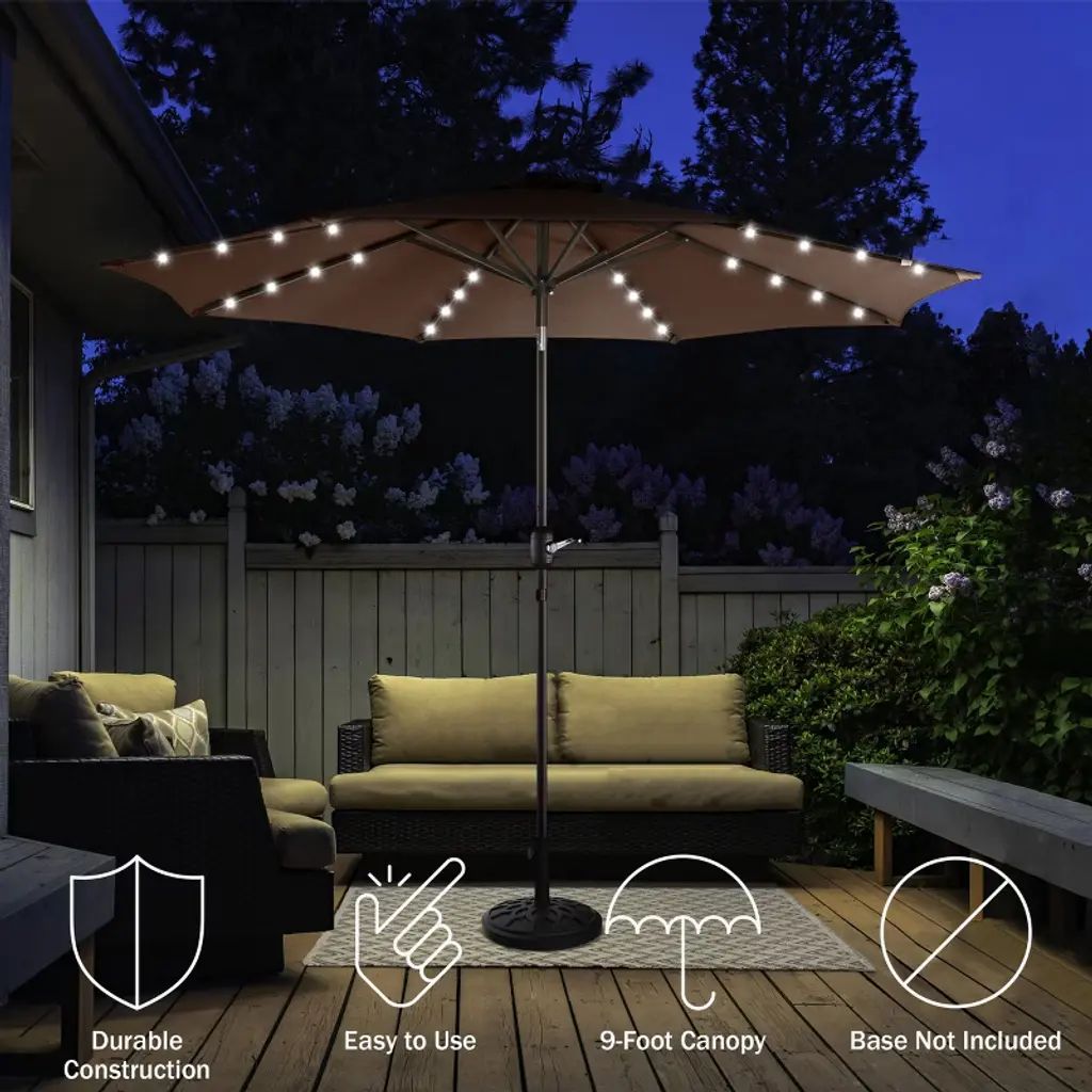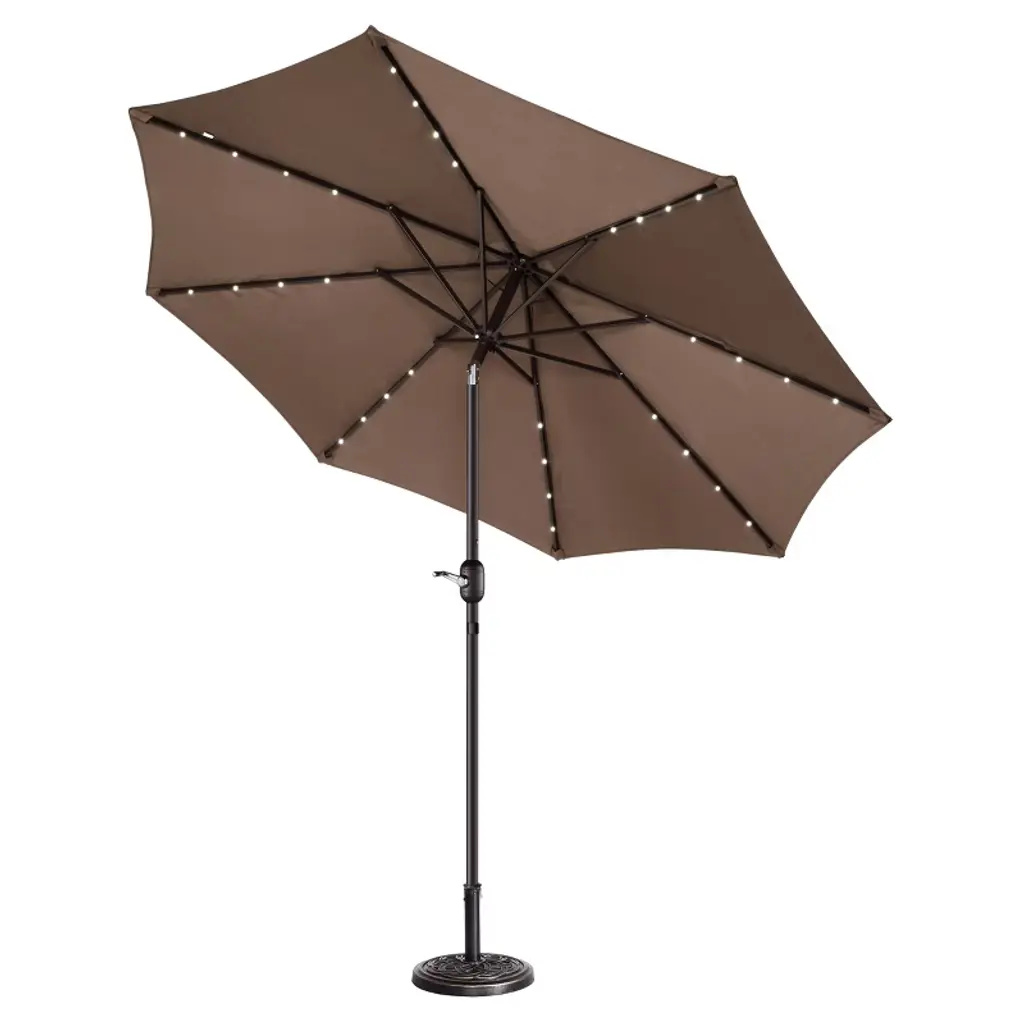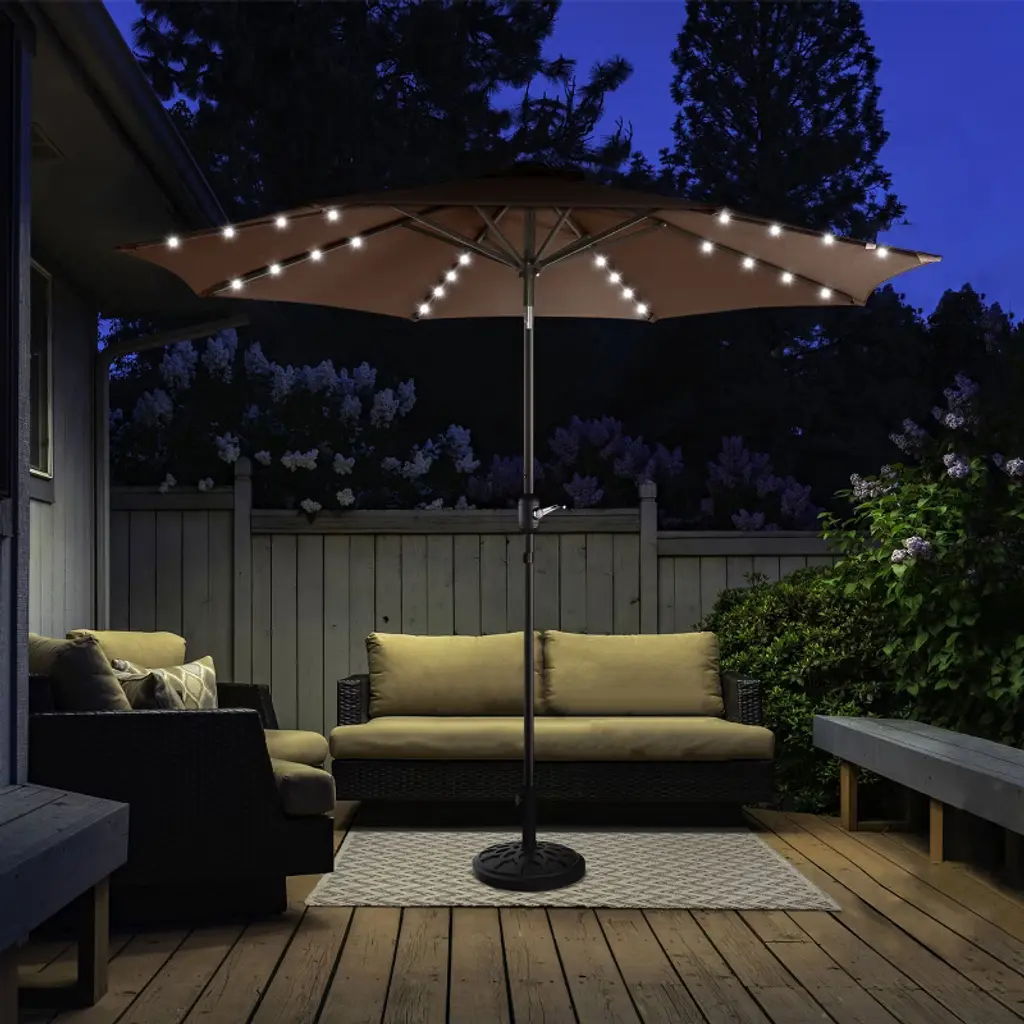 Enhance the comfort and beauty of your outdoor space both day and night with the Solar Patio Umbrella by Villacera. The canopy of this deck umbrella is made of fade-resistant and water-repellent polyester with a 9-foot diameter and a vented design to allow for air circulation to keep you cool in the heat. The support pole of the patio table umbrella has an easy push-button tilt function to block angled light and a hand crank for smooth operation of the shade. This large outdoor umbrella is also perfect for evening entertaining, with 32 LED lights powered by a top solar panel and an on/off switch to control the lights.