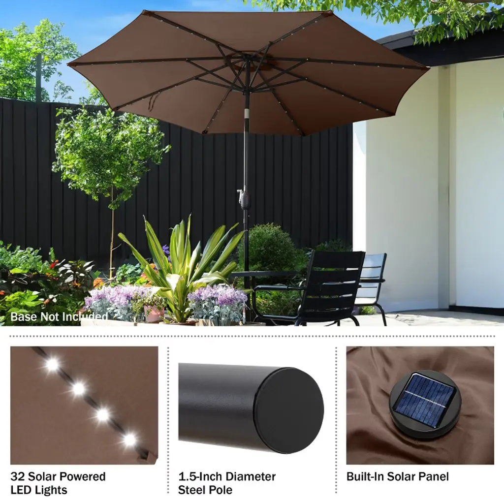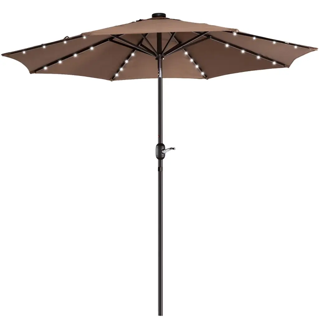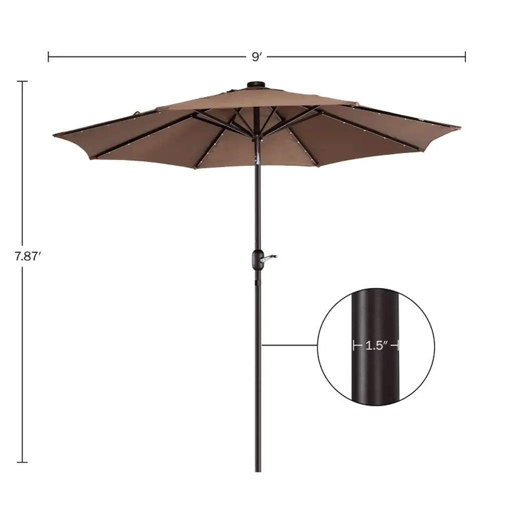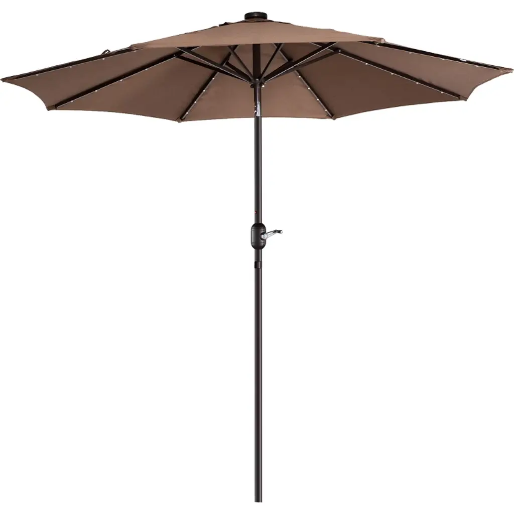 Enhance the comfort and beauty of your outdoor space both day and night with the Solar Patio Umbrella by Villacera. The canopy of this deck umbrella is made of fade-resistant and water-repellent polyester with a 9-foot diameter and a vented design to allow for air circulation to keep you cool in the heat. The support pole of the patio table umbrella has an easy push-button tilt function to block angled light and a hand crank for smooth operation of the shade. This large outdoor umbrella is also perfect for evening entertaining, with 32 LED lights powered by a top solar panel and an on/off switch to control the lights.
