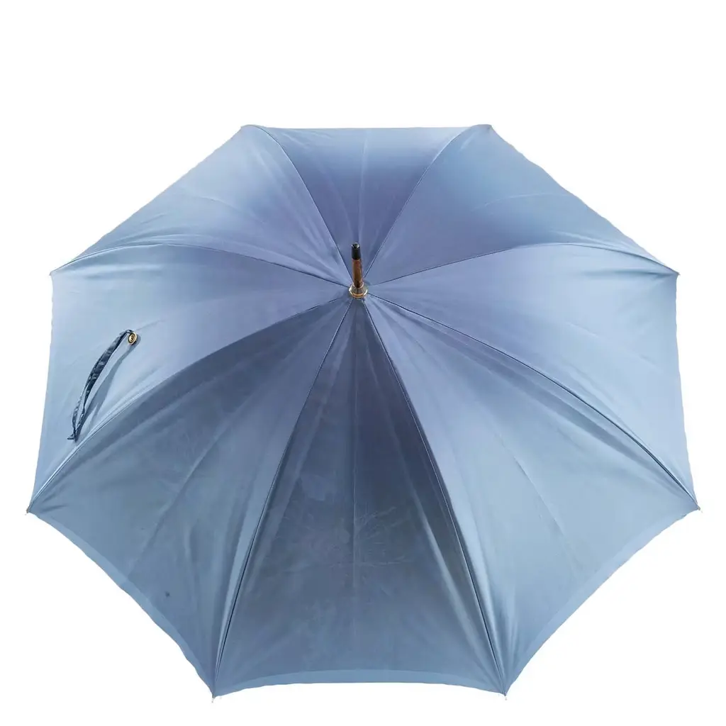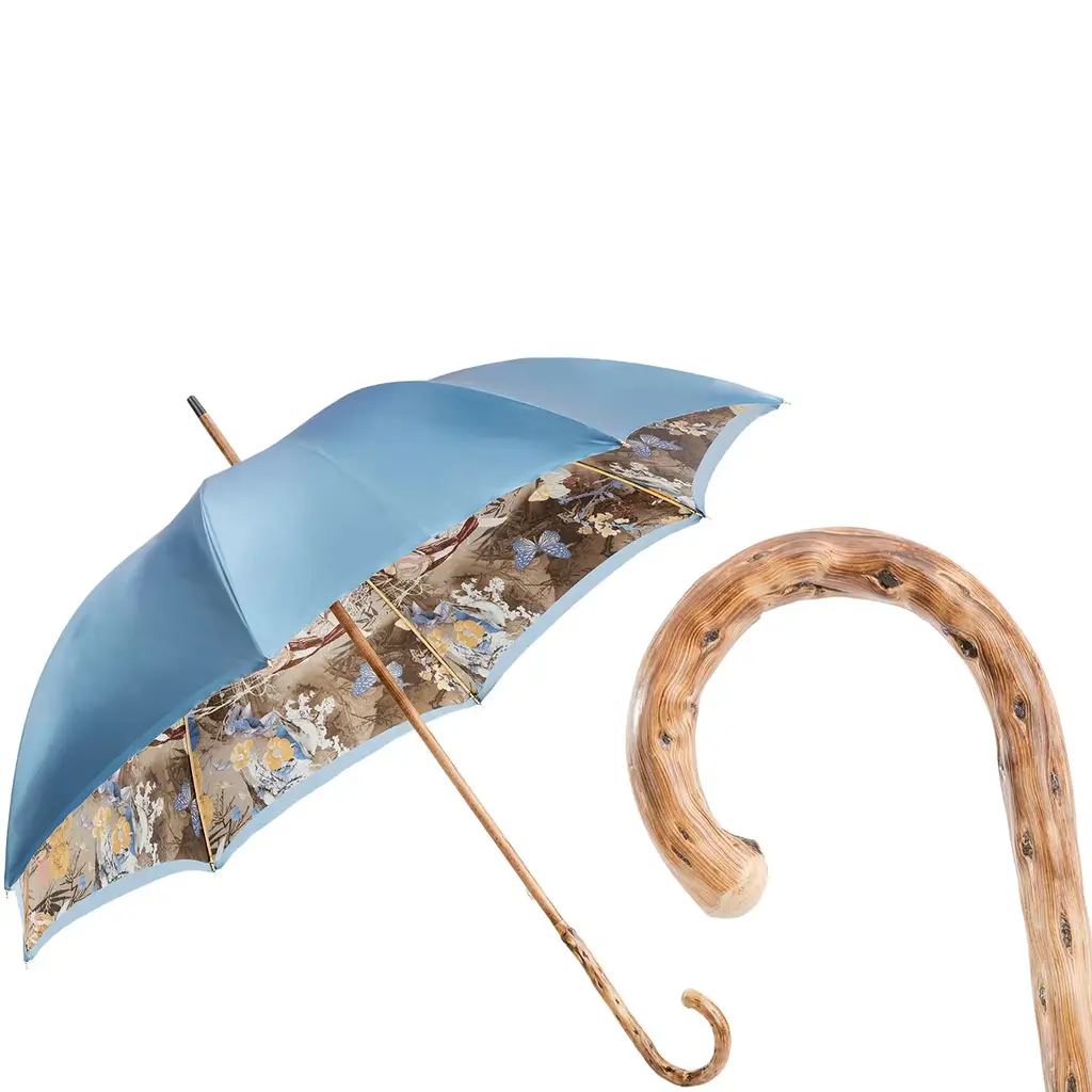 Handmade in Italy, this naturally beautiful umbrella features a 93-cm long broom wood shaft and manual opening. The canopy meaures 102 cm and is made of 100% polyester double cloth that is sky blue on the outside and decorated with a natural pattern on the inside.