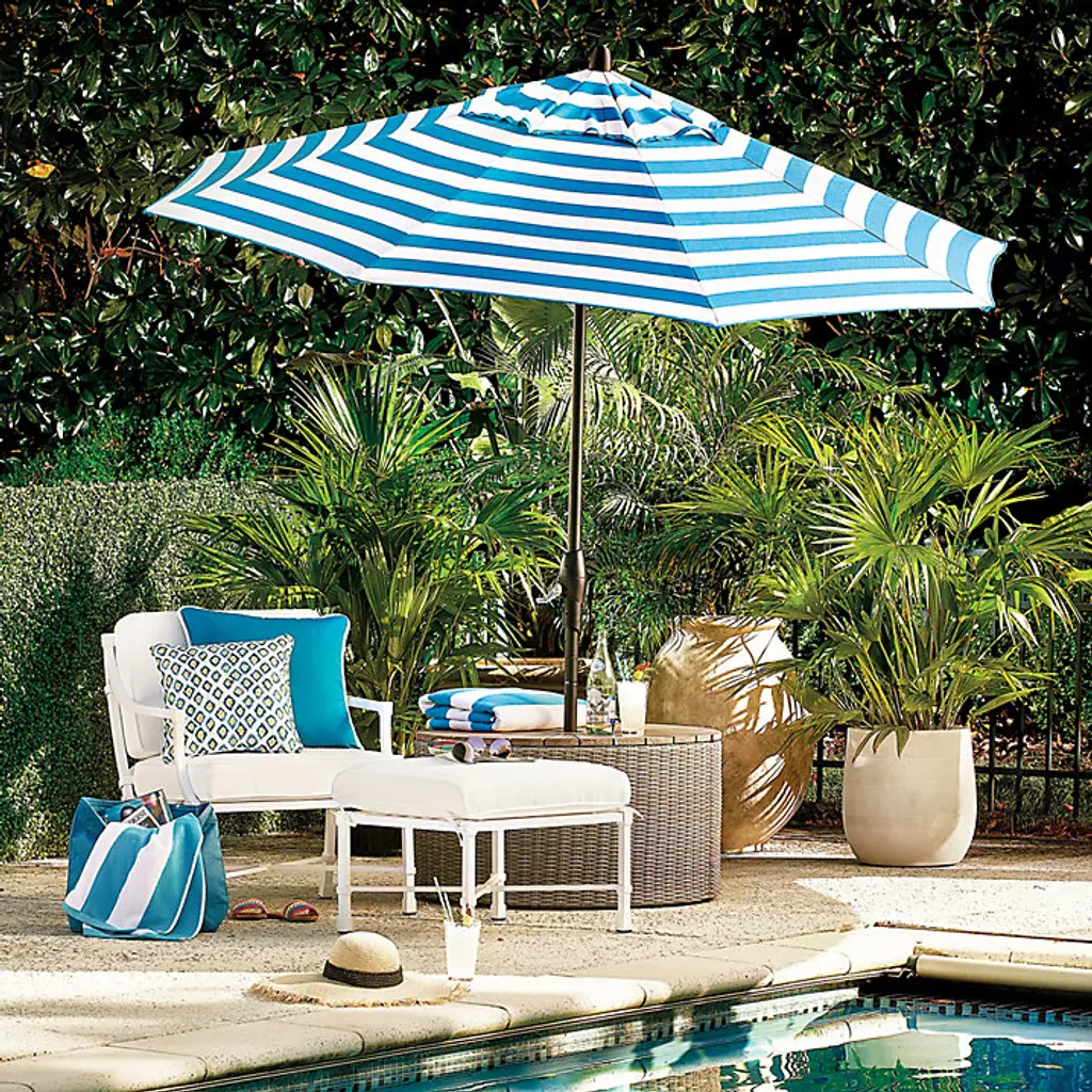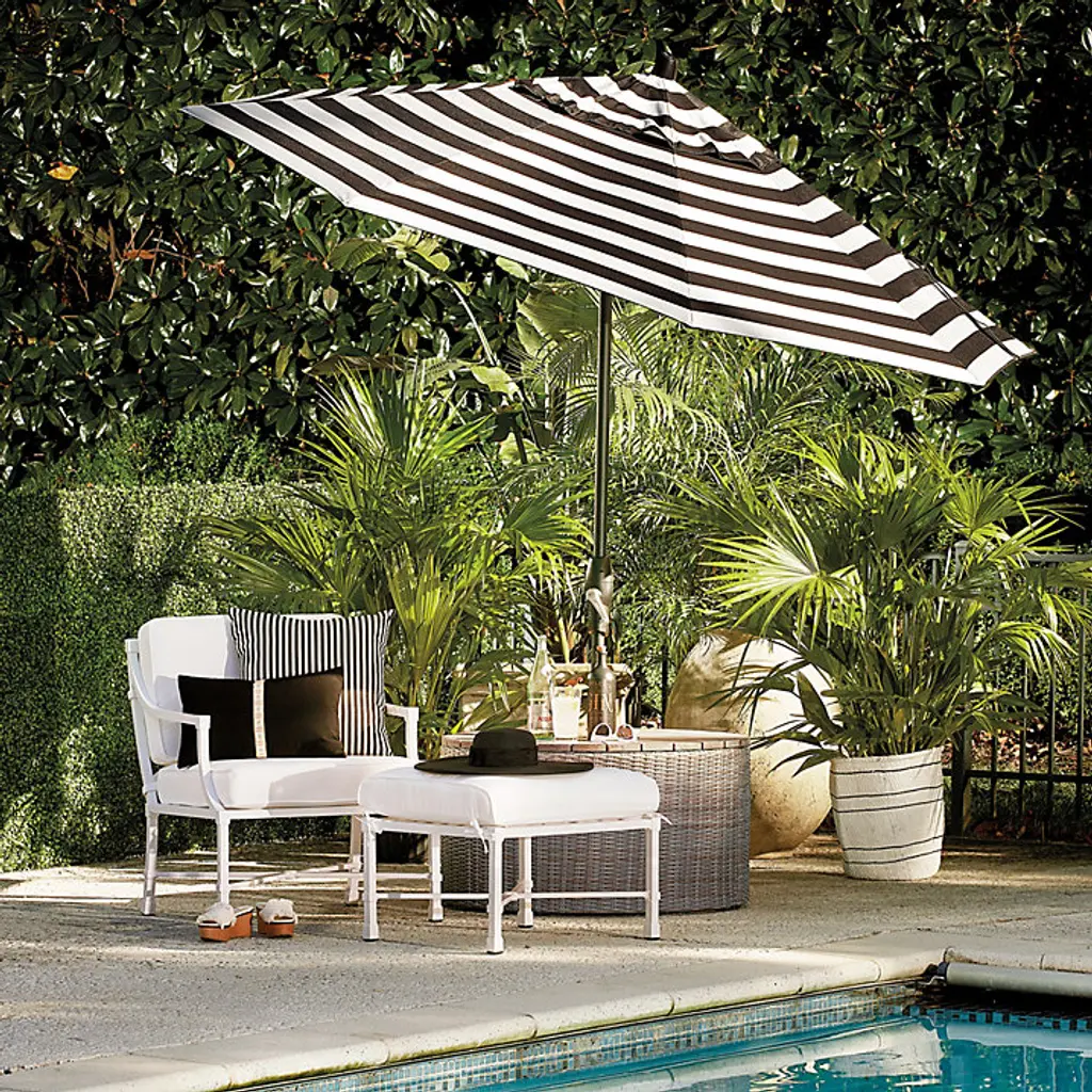 We designed this handsome patio umbrella table to coordinate with our popular Navio outdoor furniture collection. Our Navio Umbrella Table is made of resilient all-weather wicker finished in washed gray and tightly woven over two strong, rustproof aluminum demilune frames. The sunburst top is crafted of FSC-certified teak with natural finish. Demilunes push together to hide your umbrella stand, creating a round table top for serving or perching. Left untreated, the natural teak finish will weather to a warm silvery gray over time. Navio Outdoor Umbrella Table features: