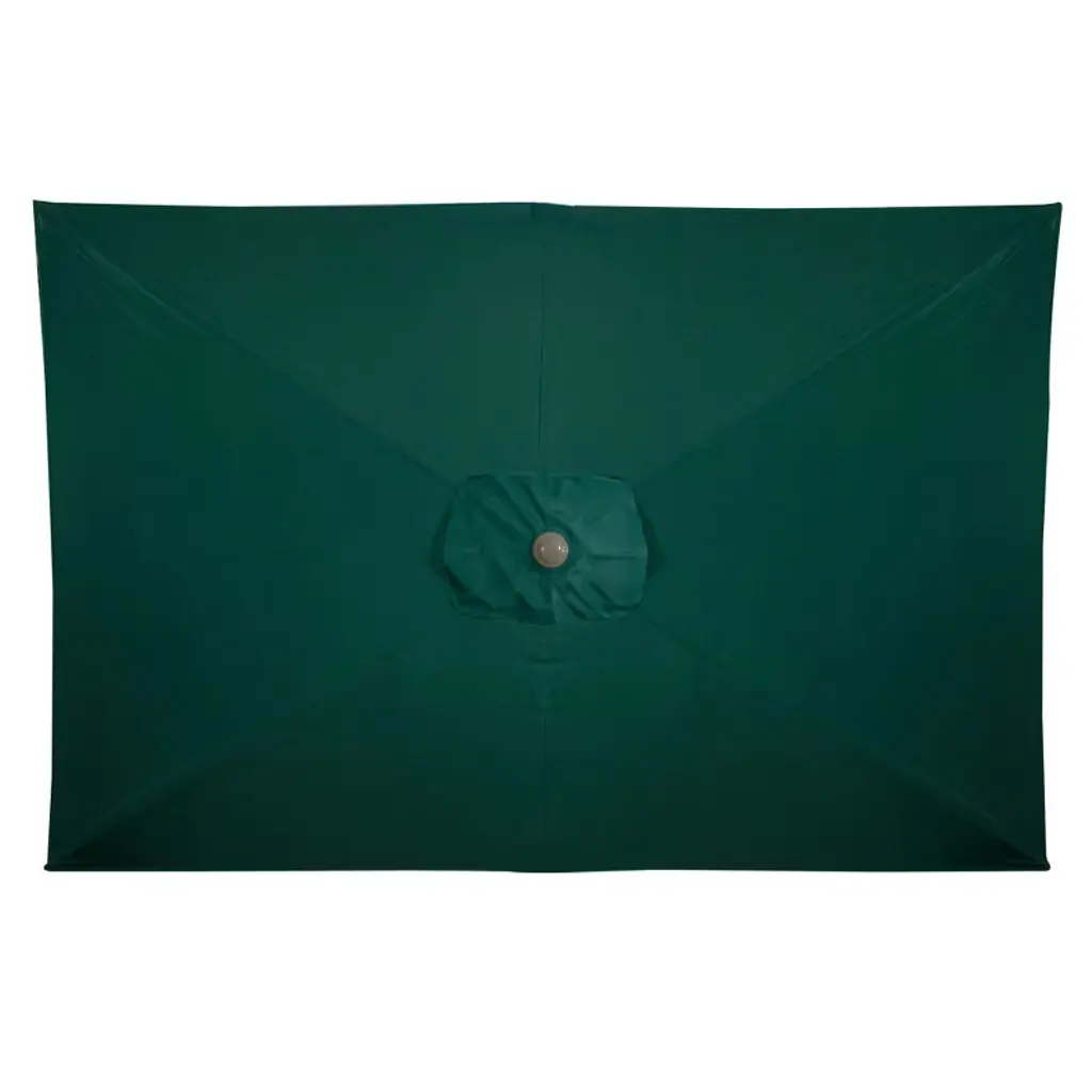 Provides ideal coverage for entertaining guests at your outdoor dinner party. Our large rectangular patio umbrella can accommodate a four to six person dining set, up to 62 inches in diameter. Features a standard hand crank mechanism that allows for ease of use, as well as aluminum and steel ribs that provide excellent canopy support. Features: Umbrella shape: rectangle Canopy color: hunter green Frame and pole color: brown Diameter of open umbrella: 10' long x 6.5' wide Height: 8.5' Pole diameter: 1.5" (38mm) Lift: hand crank 6 ribs Material(s): 160 gram polyester canopy/powder coated aluminum pole/steel ribs Note: Umbrella only, the base is not included