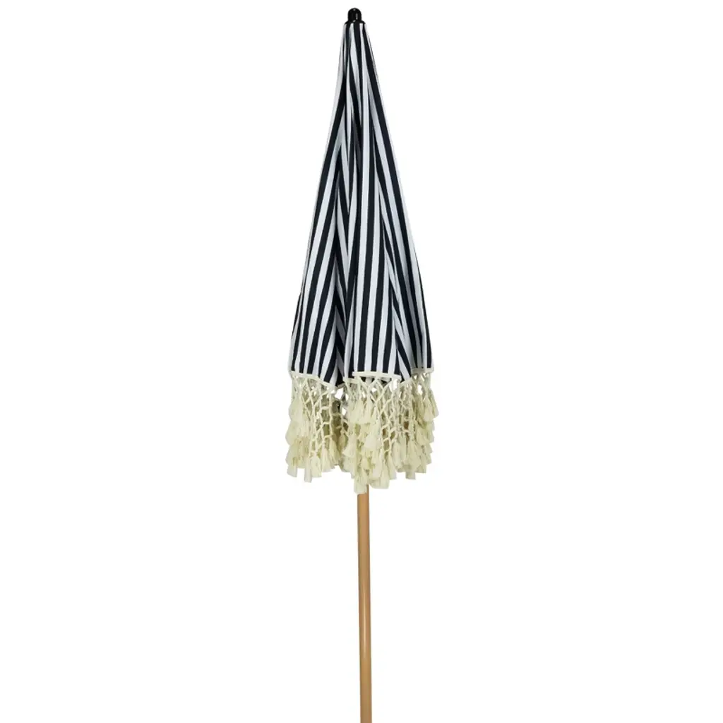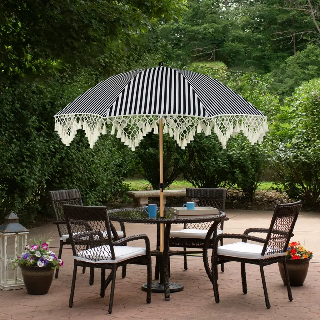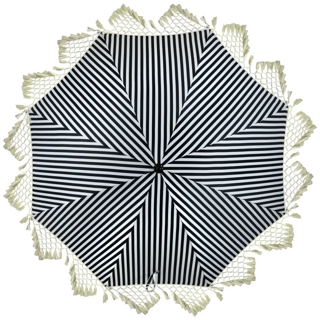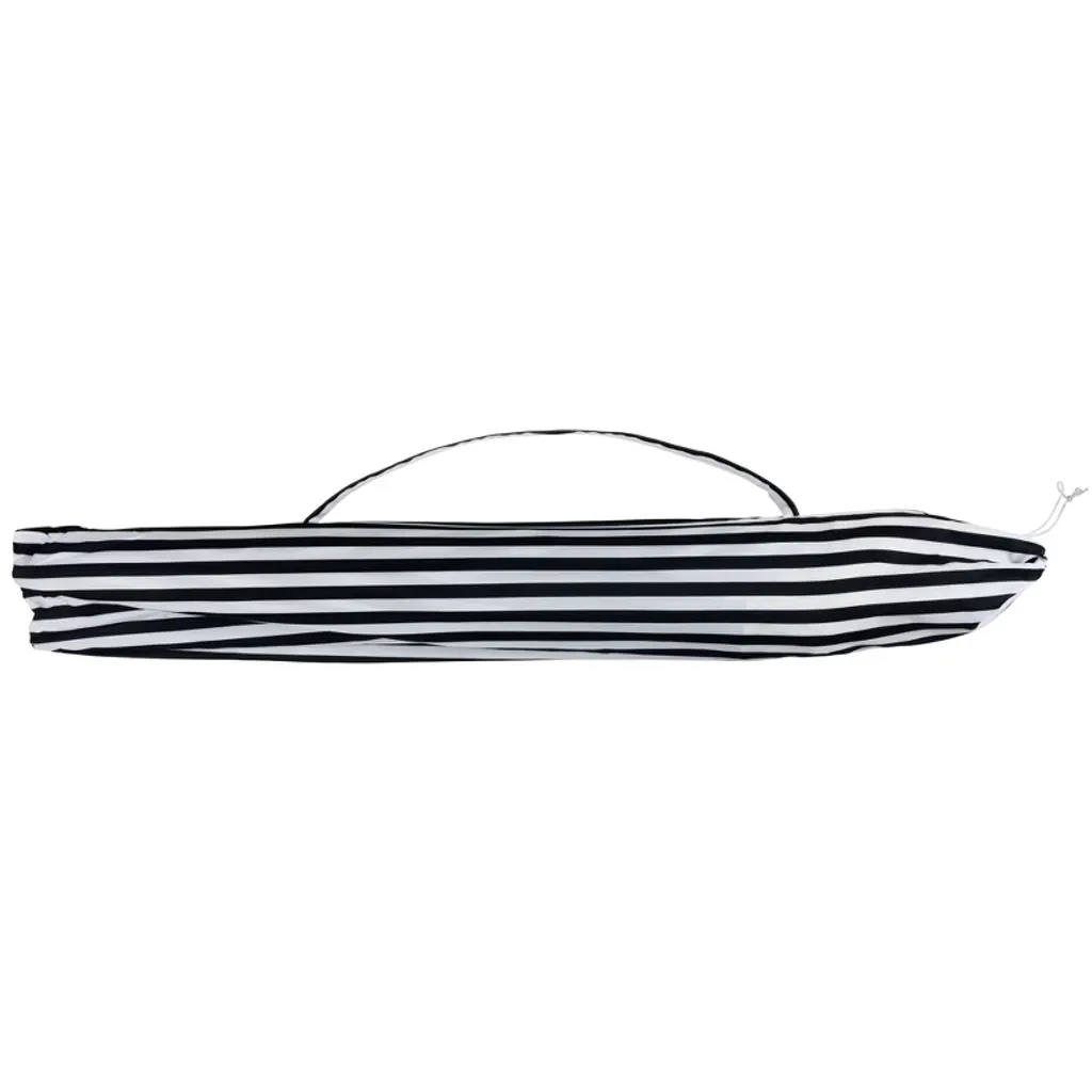 Enjoy your outdoor space with this sturdy outdoor patio and beach tilting umbrella. This octagon umbrella features a striking black and white striped canopy. Decorative tassels give it a chic flair. Durable and versatile, this umbrella can be anchored in sand or soil and can be used in a traditional umbrella stand. Product Features:
