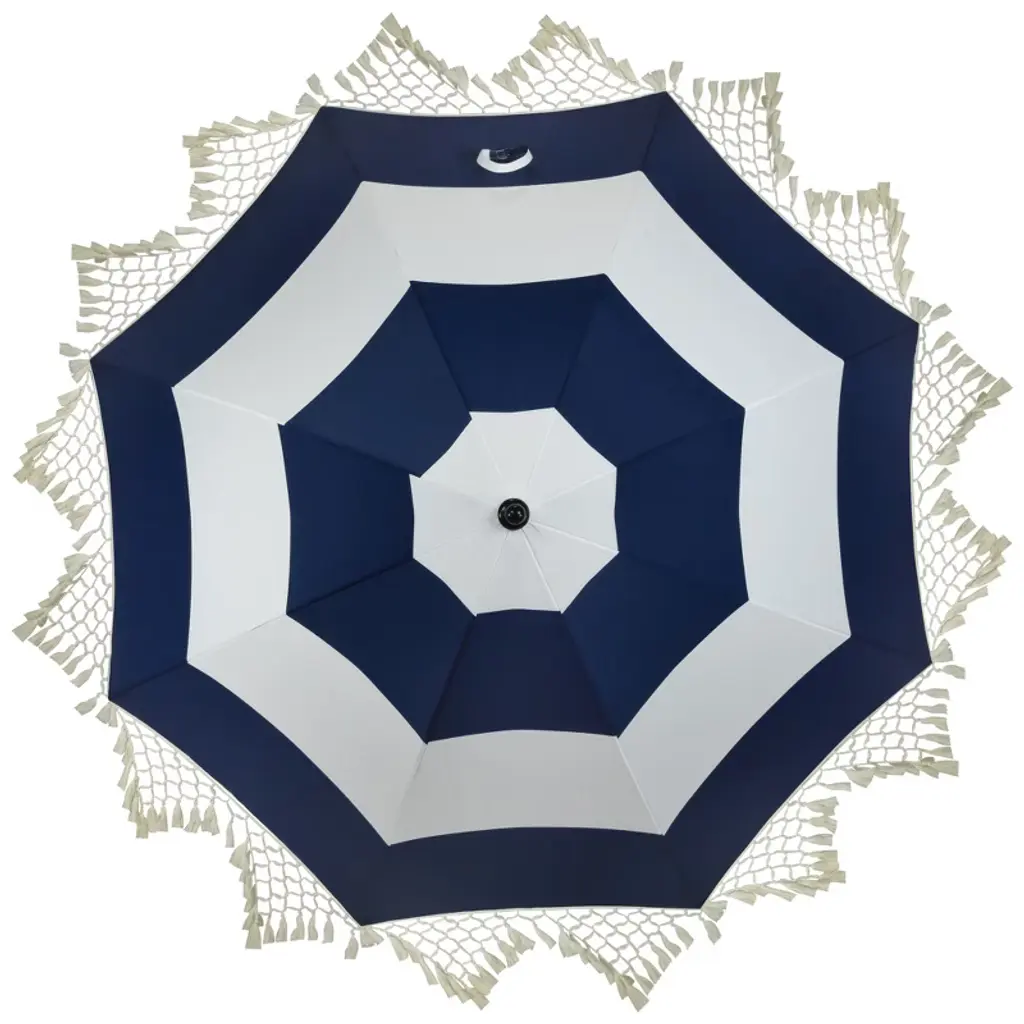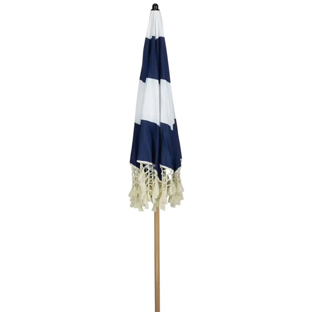 Transform your outdoor space with this coastal-inspired patio umbrella. This octagon shaped umbrella features a stylish navy blue and white striped canopy that adds a touch of elegance to any setting. Designed for convenience and versatility, this tilting umbrella includes a hook and loop fastener on the canopy for easy storage, along with a storage/carrying bag with a handle for effortless transport. Durable and versatile, this umbrella can be anchored in sand or soil and can be used in a traditional umbrella stand. Product Features: Umbrella shape: octagon Canopy color: navy blue and white Frame and pole color: beige Diameter of open umbrella: 6.5' Height: 6.5' Pole diameter: 1.5" (38mm) 8 ribs Hook and loop fastener Matching storage/carrying bag with handle included The umbrella's borders are adorned with tassels Push button tilting feature Rubber tipped stake pole for use in sand or soil Can be used with an umbrella stand Material(s): 160 gram polyester canopy/powder coated aluminum pole/steel ribs Note: Umbrella only, base is not included