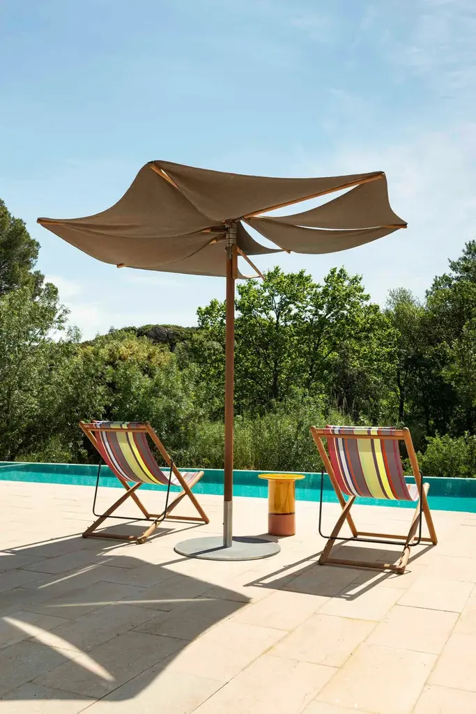 Om is an umbrella with base 50KG. Inspired by classic mediterranean canopies and umbrellas, Om brings a twist on a wellestablished product. Because of its innovative unfolding mechanism, the umbrella can be adapted to any need, wether it is fully, half or hardly open, providing different types of shade for every position.Materials: Iroko wood / stainless steelOM is a collection of shades, designed and manufactured 100% in Spain, which reinvents and bring a twist on the very characteristic umbrellas from the Mediterranean coast. Its versatility, enable its adaptation to any space and function, creating fresh and relaxing environment. Because of its innovative unfolding mechanism, the umbrella can be adapted to the needs of the moment, whether it is fully, half or hardly open, providing different shade for each position. When the canopy is closed, a simple mechanism allows a 360° rotation of the canopy creating a vane effect when the wind blows.
