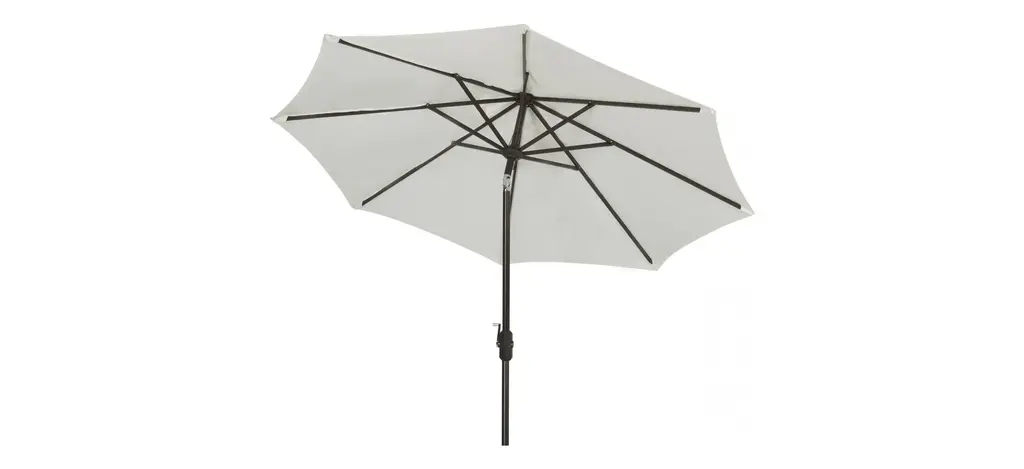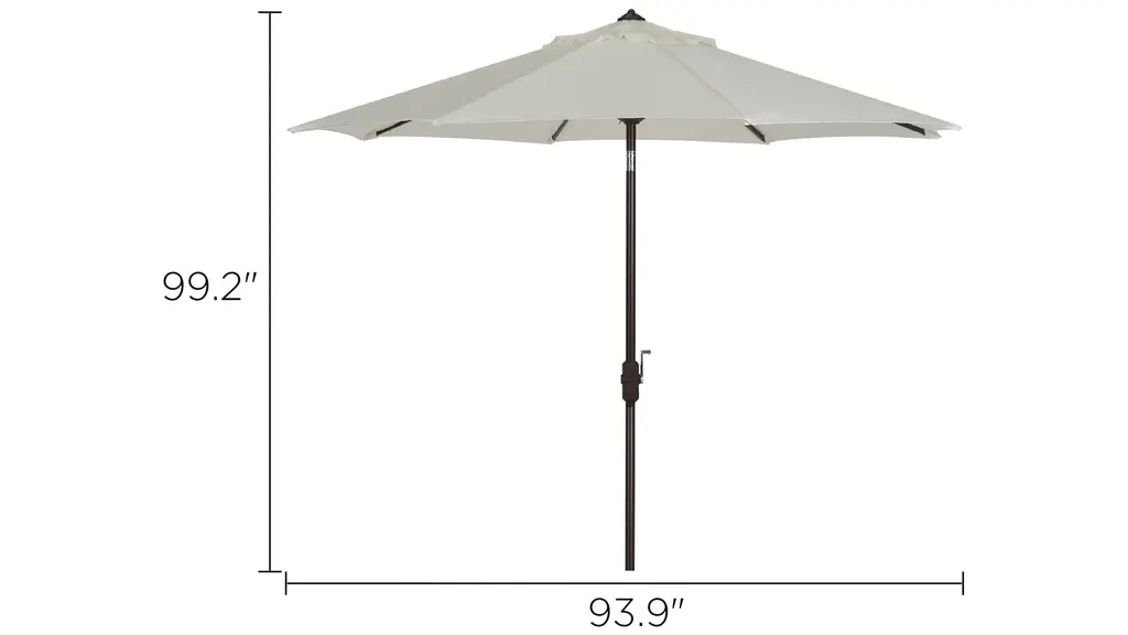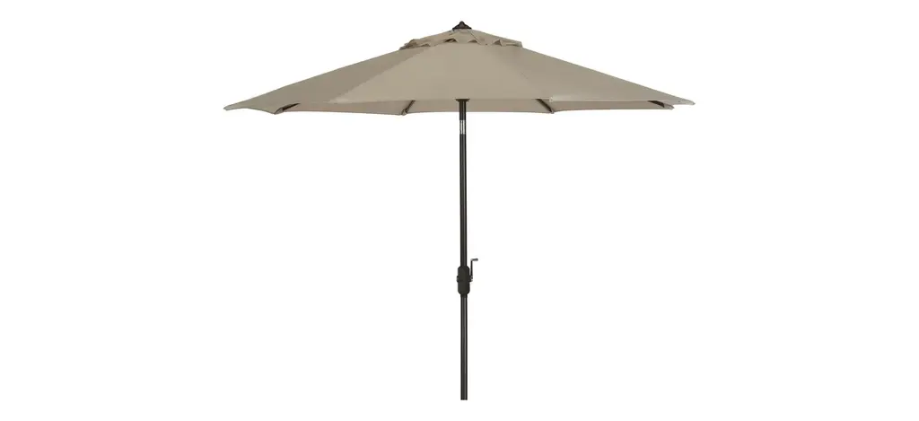 Conjure images of the Riviera with a classic market umbrella for dining al fresco at a romantic cafe. Keep cool on any patio with this sturdy, wind and weather resistant design with brown aluminum frame and natural polyester fabric on a nine-foot canopy. Includes auto tilt crank mechanism.