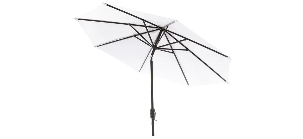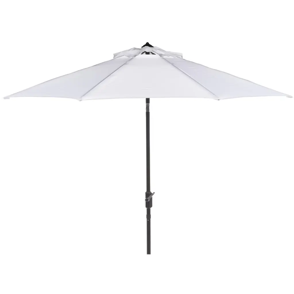 Conjure images of the Riviera with a classic market umbrella for dining al fresco at a romantic caf_. Keep cool on any patio with this sturdy, wind and weather resistant design with brown aluminum frame and white polyester fabric on a nine foot canopy. Includes auto tilt crank mechanism.