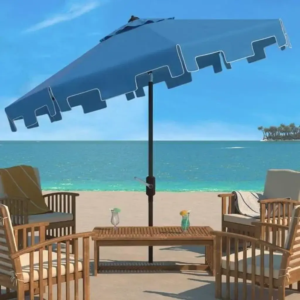The classic market umbrella gets a chic makeover with fashion-forward Pacific blue fabric and a valance for extra sun protection and European flair. Its nine foot polyester canopy and sturdy frame make it the ideal umbrella for veranda or pool deck. Includes easy crank and tilt mechanism. Store outdoor furniture indoors or cover well when not in use. Remove wooden furniture from standing water. Dust regularly with small brush or vacuum. Spills should be taken care of immediately before they harden or stain with a slightly dampened sponge. Do not use bleach solutions. Assembly Required? Yes CLOSE: 6.1"W x 6.1"D x 98.82"H Materials: Aluminum, Polyester