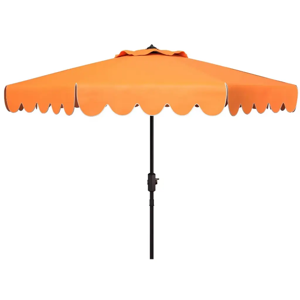 The signature white backdrop of Santorini’s lush legendary resort inspired this eleven-foot crank umbrella. Its sunny orange hue features a scalloped trim to create an outdoor retreat for the modern tastemaker. Store outdoor furniture indoors or cover well when not in use. Remove wooden furniture from standing water. Dust regularly with small brush or vacuum. Spills should be taken care of immediately before they harden or stain with a slightly dampened sponge. Do not use bleach solutions. Assembly Required? Yes CLOSE: 6.1"W x 6.1"D x 105.51"H Materials: Aluminum, Polyester